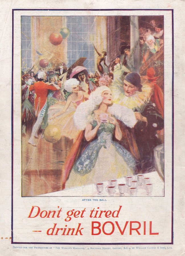 AFTER THE BALL | Don't get tired - drink BOVRIL Full page (20x29cm) colour advertisement published in The Woman's Magazine 1927. Diagonal crease and a little grubby.