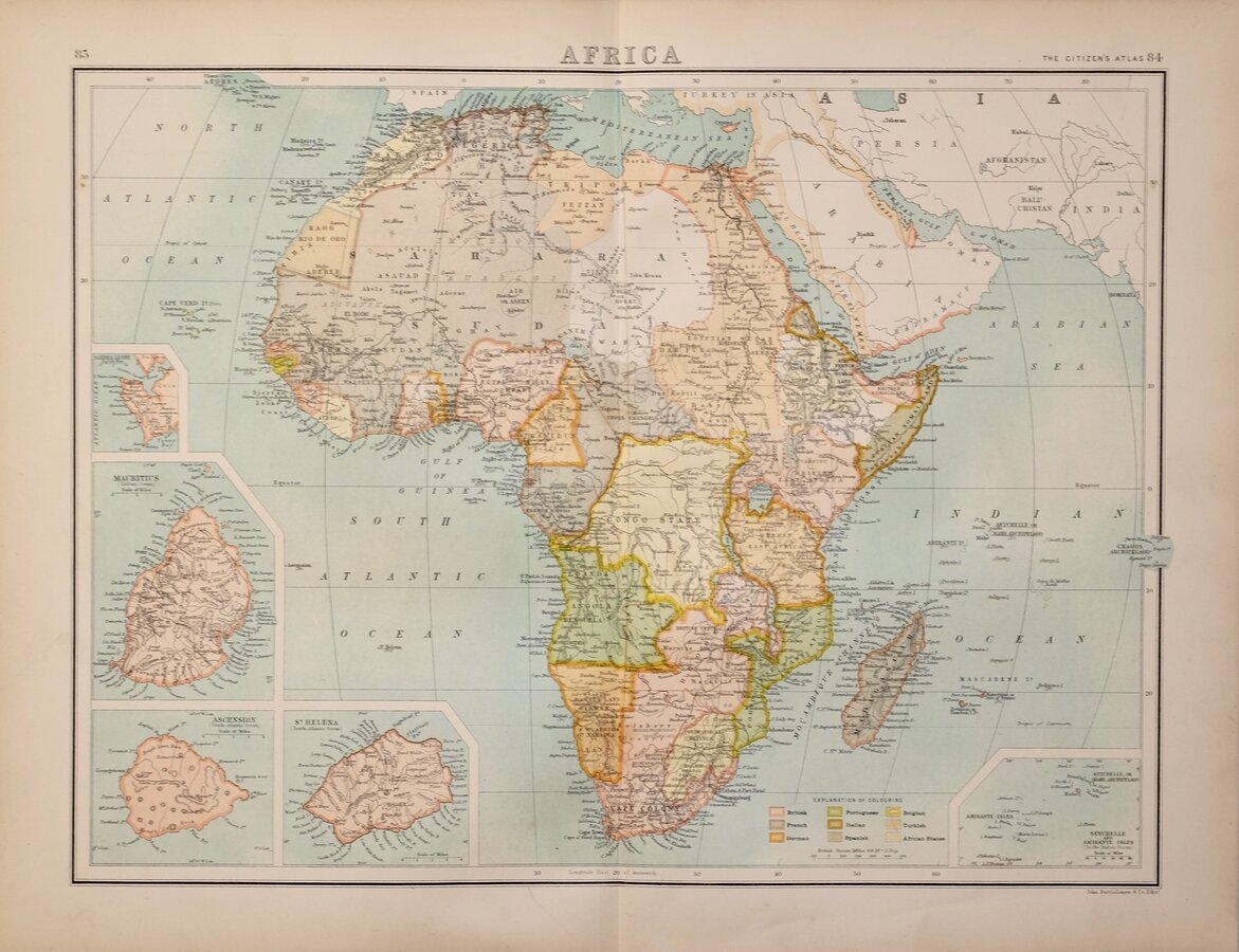 Colour lithograph printed map by John George Bartholomew (1860-1920), geographer and cartographer to King George V. and successor to the famous mapmaking and engraving business founded by his great-grandfather George Bartholomew (1784-1871). Published in Bartholomew's Citizen's Atlas of the World...George Newnes, London 1898.