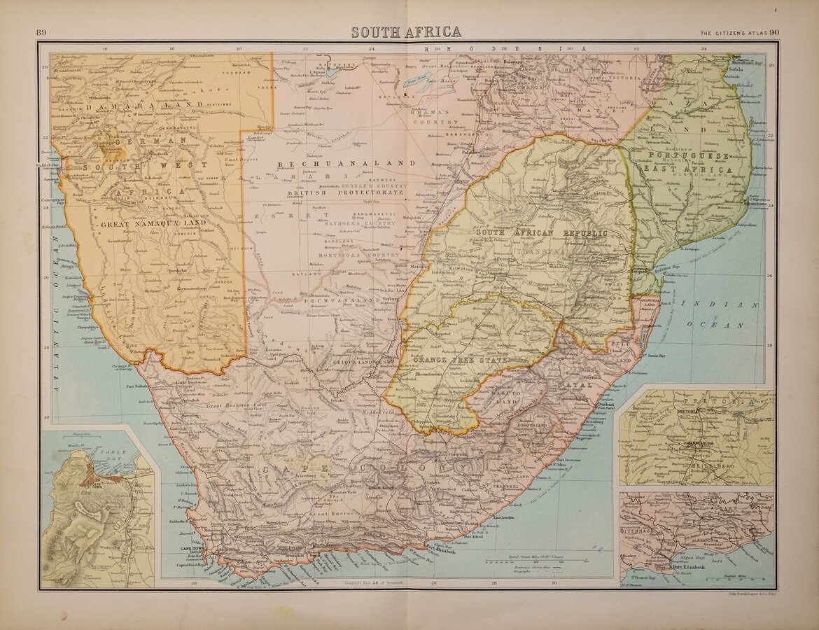 Colour lithograph printed map by John George Bartholomew (1860-1920), geographer and cartographer to King George V. and successor to the famous mapmaking and engraving business founded by his great-grandfather George Bartholomew (1784-1871). Published in Bartholomew's Citizen's Atlas of the World...George Newnes, London 1898.