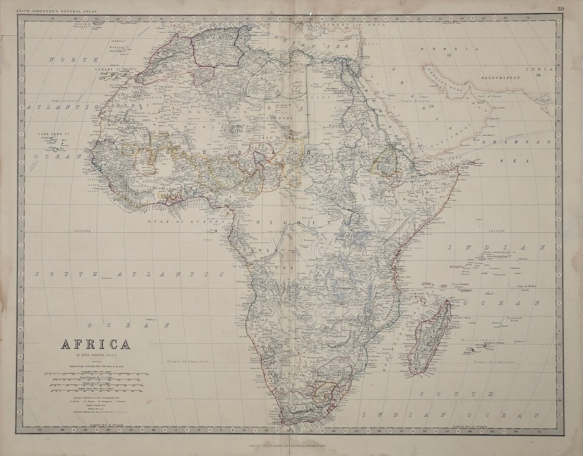 Large lithographic printed map published in The Royal Atlas Of Modern Geography Exhibiting, In A Series Of Entirely Original And Authentic Maps, The Present Condition Of Geographical Discovery And Research In The Several Countries, Empires, And States Of The World By The Late Alexander Keith Johnston...With Additions And Corrections To The Present Date By T.B. Johnston... W.& A.K. Johnston, Edinburgh And London, MDCCCXCIII.