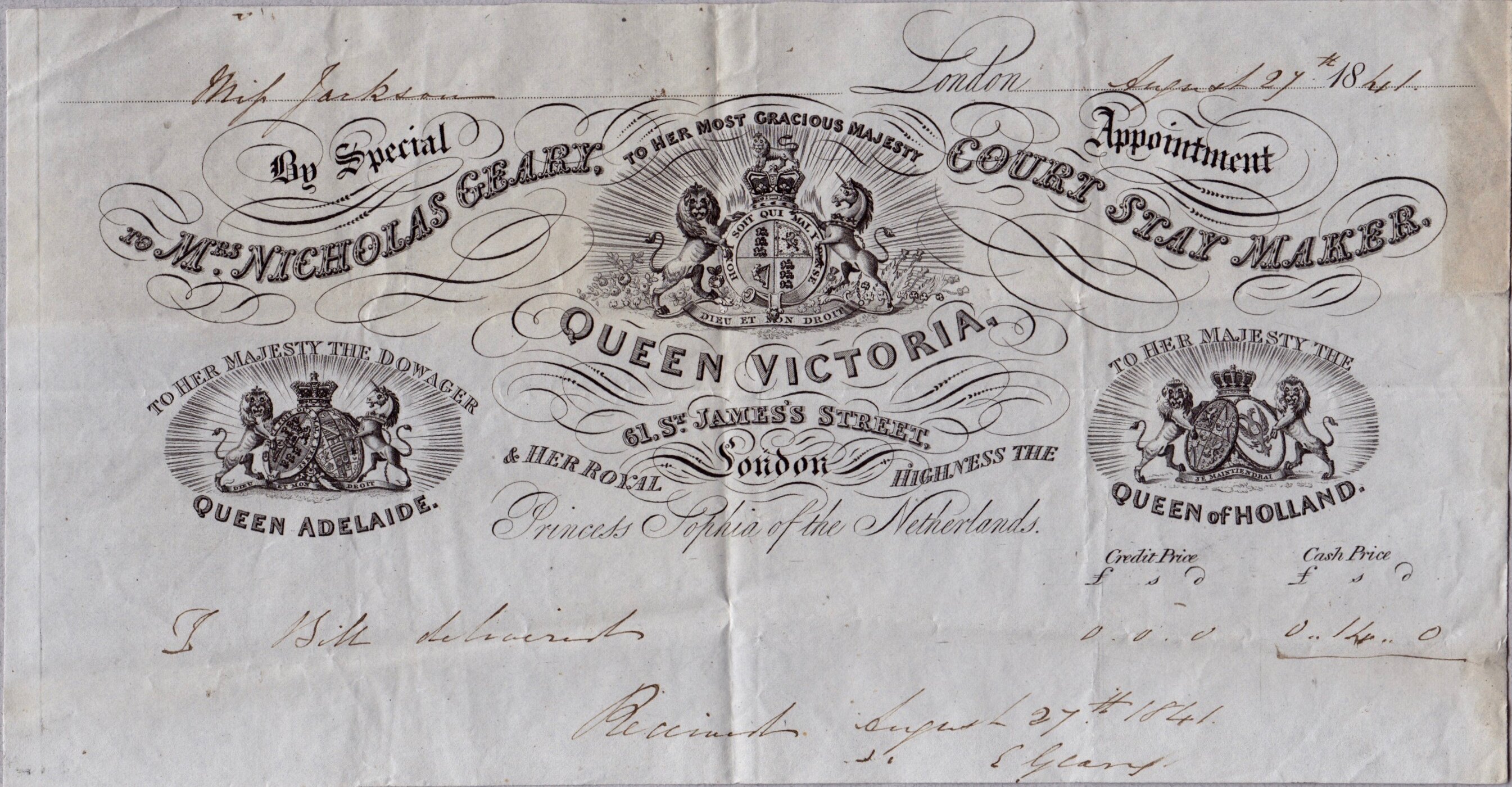 2 Invoices from Mrs Nicholas Geary of 61 St James's Street London, Court Stay Maker to Queen Victoria, Queen Adelaide, Queen of Holland (Anna Pavlovna) and Princess Sophie of The Netherlands.