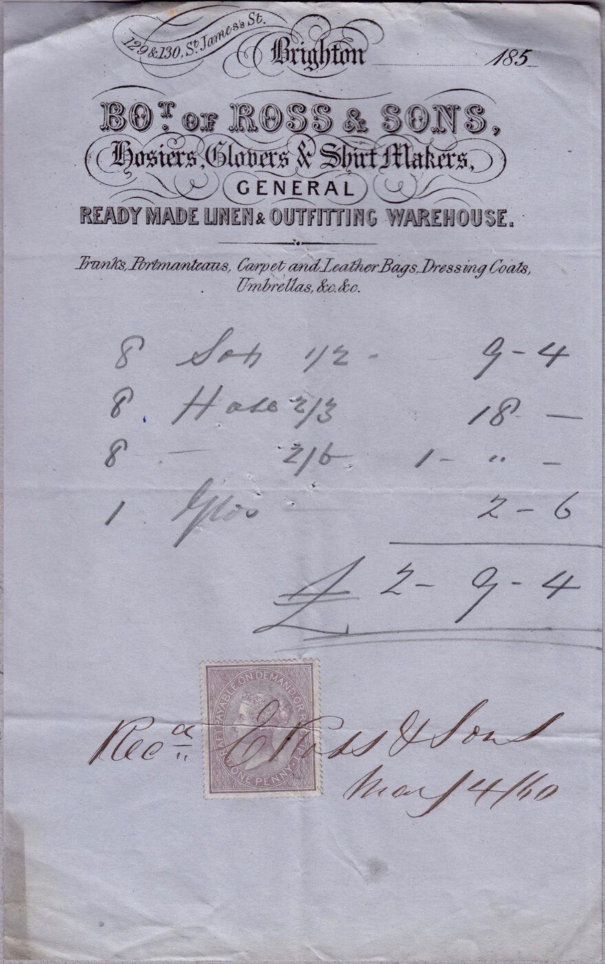 5 Receipts and 2 Invoices from Ross & Sons, Hosiers, Glovers & Shirt Makers, 129 & 130, St. James's Street, Brighton to Mrs Parker. Various dates in 1860.