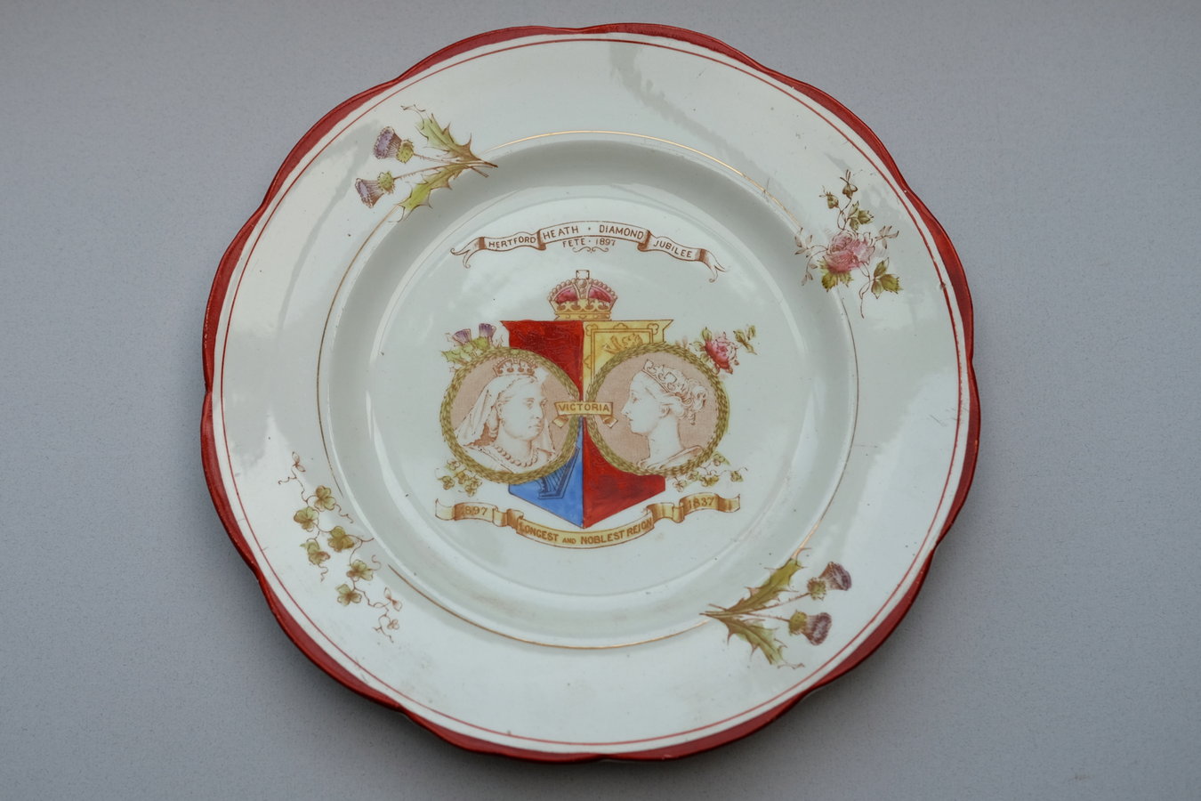 Transfer printed portraits of Queen Victoria at 1897 and 1837 encircled in wreaths laid over the Royal Arms surmounted by a crown with thistle and rose decoration. Hand colour to arms and decorative eelments and plate edge. The wording reads: HERTFORD HEATH DIAMOND JUBILEE | FETE 1897 | VICTORIA | 1897 LONGEST AND NOBLEST REIGN 1837.