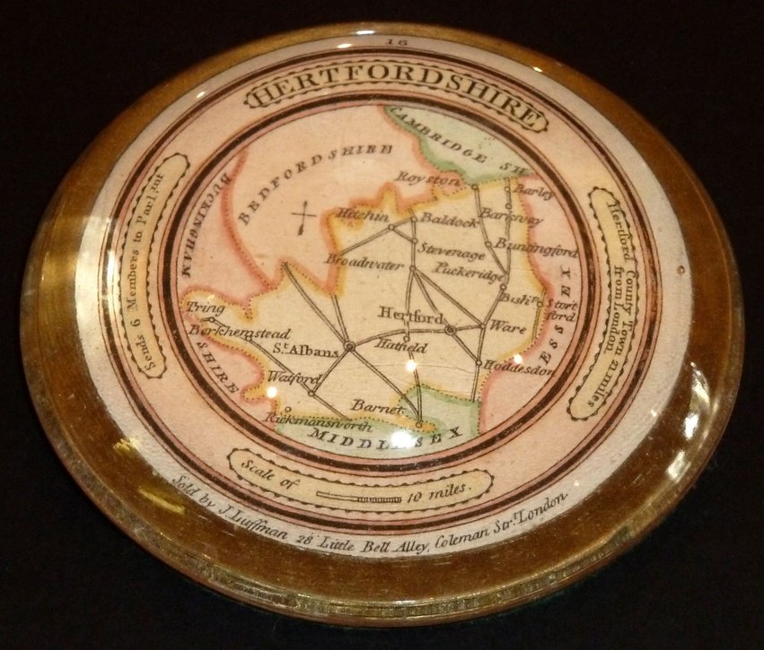 Glass paperweight with original circular map of Hertfordshire by John Luffman. The map has been trimmed to fit the paperweight but has no loss of the printed area. This series of small circular maps were published in a small Georgian School atlas by John Luffman in 1803 and 1806. The survival rate of these atlases was low and the maps are now rare.