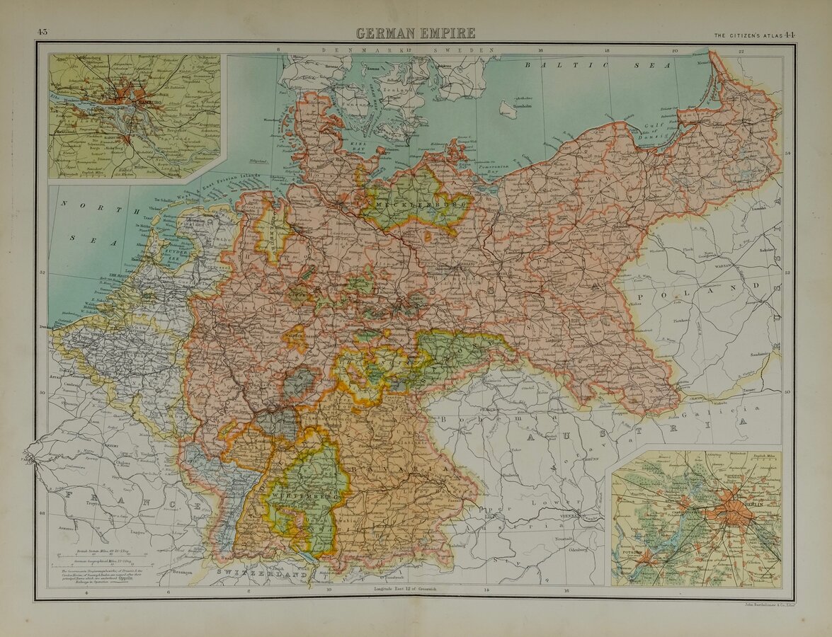 GERMAN EMPIRETHE CITIZEN'S ATLASJohn Bartholomew & Co. Edinr.Double page colour printed map with inset maps of the environs of Berlin and Hamburg.