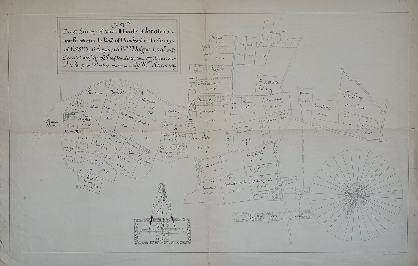 AN | Exact Survey of Severall Parcell's of land lying. | near Rumford in the Parish of Hornchurch in the County | of ESSEX Belonging to WmHolgate Esqr. | Described in the year 1696 and found to containe 373. Acres-3 | Roods & 27 Perches -By W:m Stane.