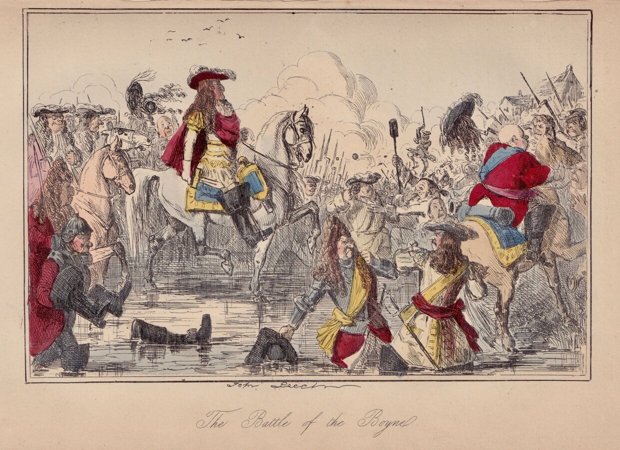 The Battle of the Boyne Etching by John Leech (1817-1864) published in The Comic History of England by Gilbert Abbott A'Beckett...The Punch Office, London 1847-48. Original hand colour.