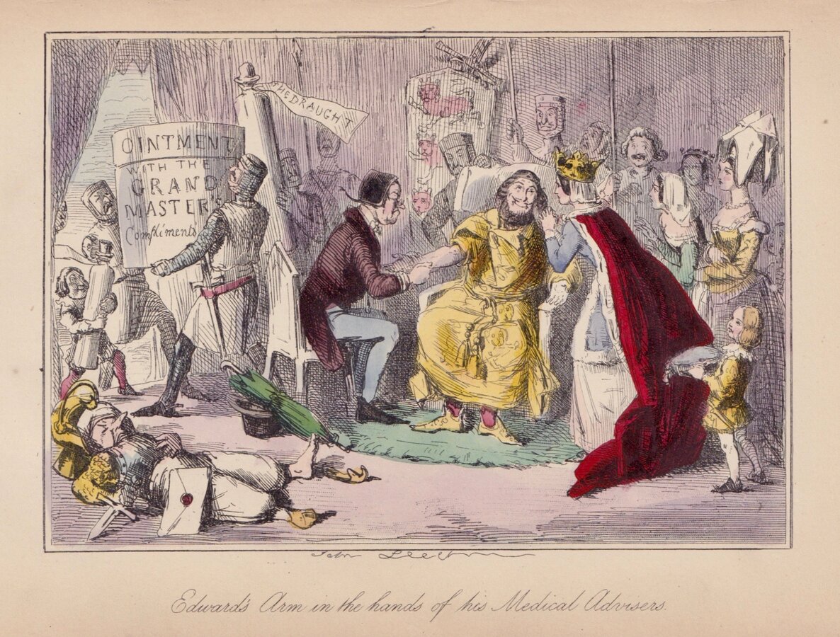 Edward's Arm in the hands of his Medical Advisers. Etching by John Leech (1817-1864) published in The Comic History of England by Gilbert Abbott A'Beckett...The Punch Office, London 1847-48. Original hand colour.