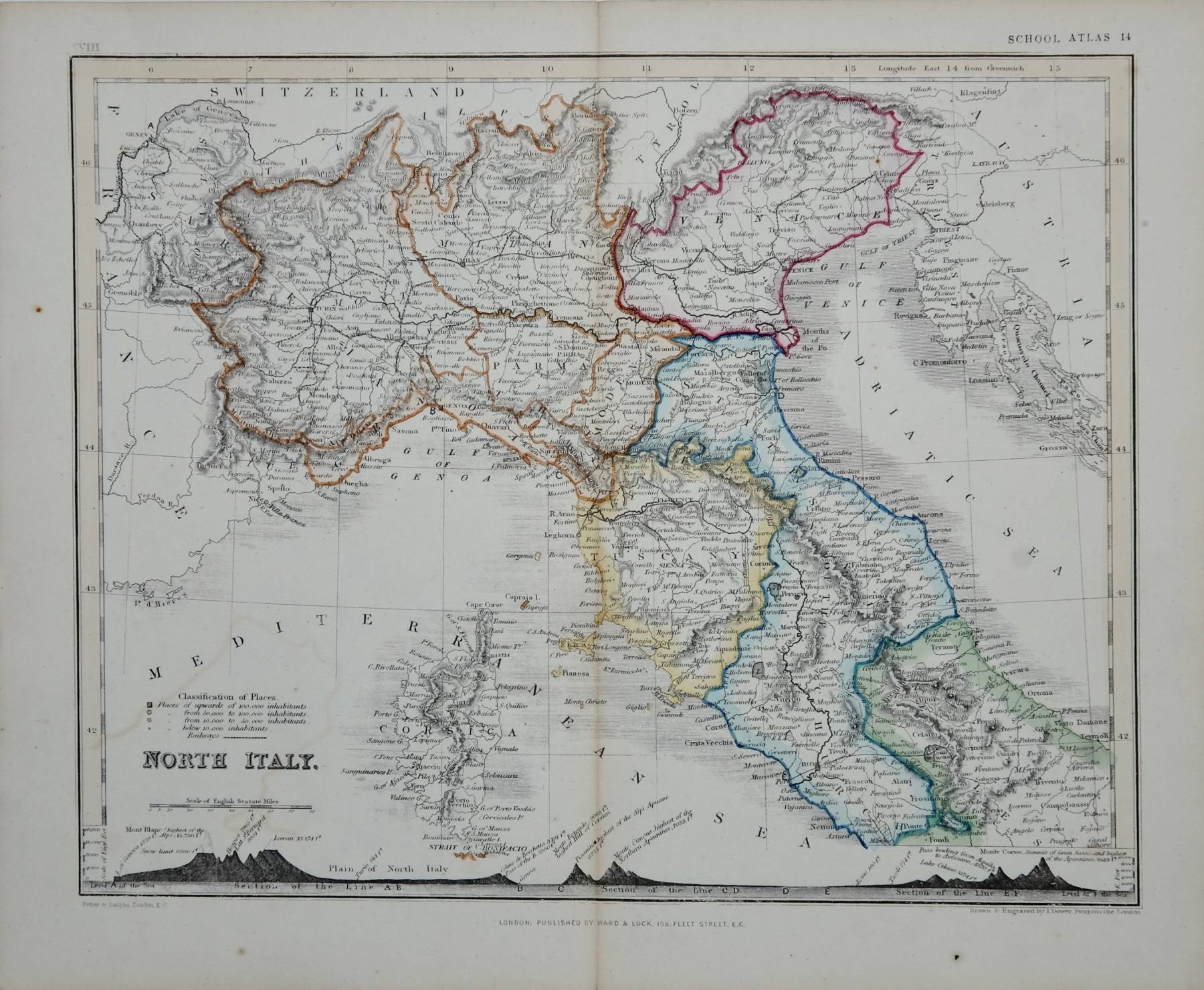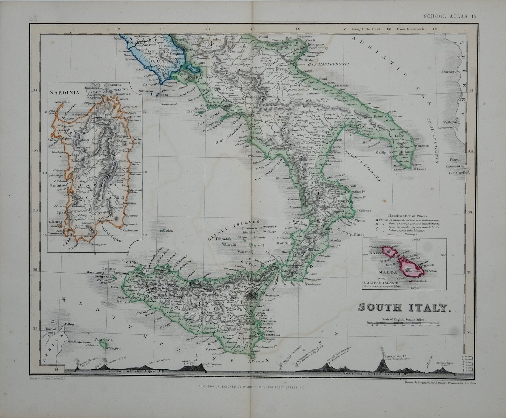 Pair of maps, North Italy and South Italy including Corsica, Sicily, Sardinia, Malta and Gozo. Cross sections along bottom borders.