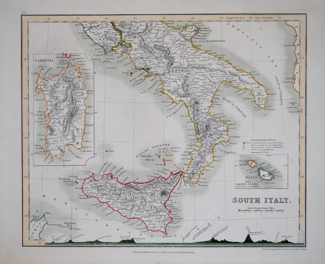 Hand coloured steel engraving. Cross sections along bottom border. Inset maps of Sardinia and Malta & Gozo.