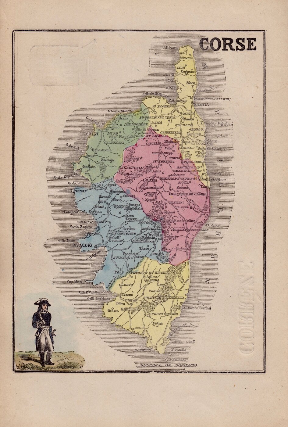 Hand coloured wood engraving with vignatte of Napoleon Bonaparte, born on the island.