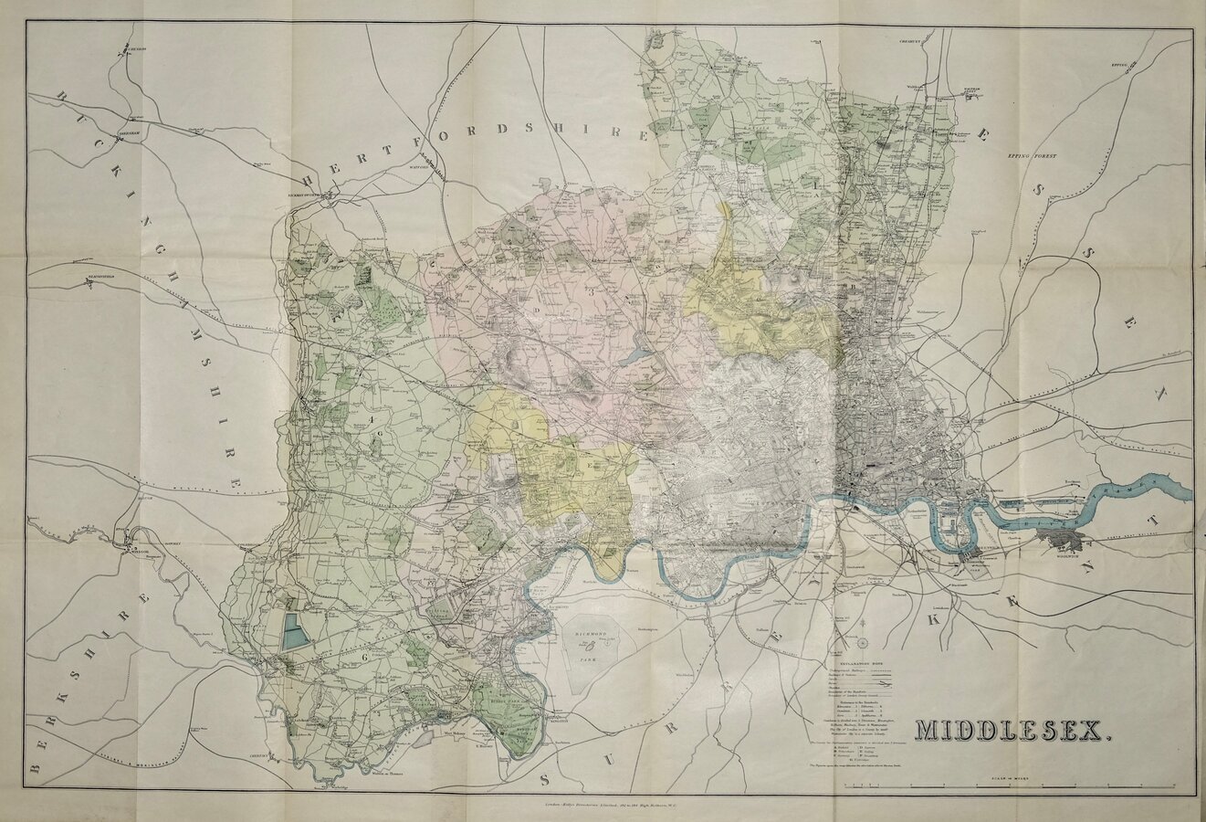 Original hand colour wash showing the county Parliamentary Divisions, parks and water features. Deatailed plan of London. The King George V reservoir at Chingford is not shown which was commenced by the Metropolitan Water Board in 1908 and completed in 1912. The reservoir is shown on later editions giving us a probable date of 1910 for the publication of this map, in Kelly's Directory of Essex, Hertfordshire and Middlesex.