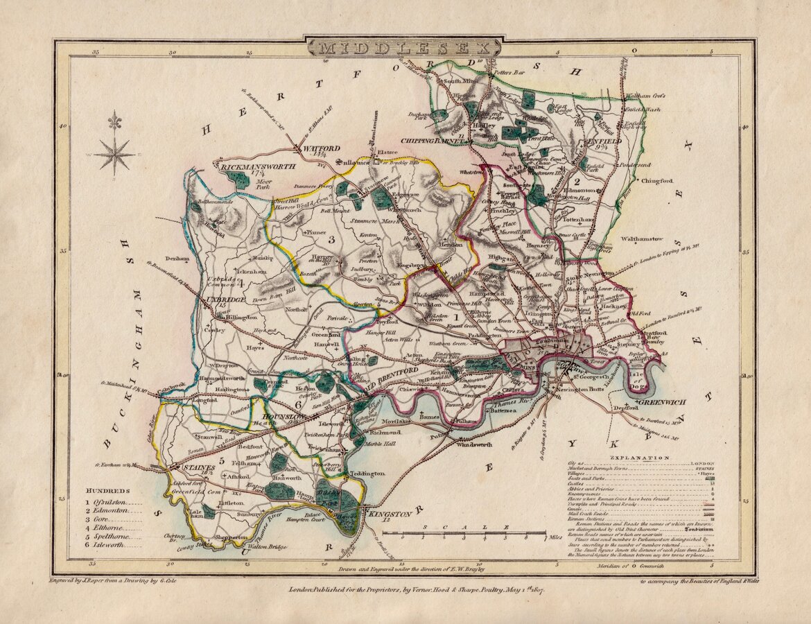 Engraved by John Roper (1771-1810), a London engraver and copperplate printer trading from New Street Square from 1797 until his death in 1810. His widow, Mary Roper, continued the business at the same address until at least 1846. This series of maps, most drawn by G[eorge?] Cole, were intended to accompany The Beauties of England and Wales. The maps were not actually published with this work but first issued in parts as a separate series between 1804 and 1810 and first appearing in atlas form in The British Atlas published by Vernor Hood & Sharpe (& nine other publishers) in 1810. The maps were re-issued in several publications including Dugdale's Curiosities of Great Britain until 1843. Their final appearance was by lithographic transfer in Collins' railway and pedestrian atlas… published by Darton and Co. in 1858.