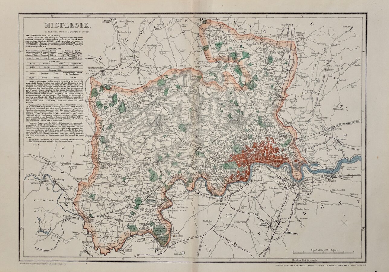 Swelling at the centrefold where pasted to the guard verso, but it remains very good hand coloured example from the fourth lithographic transfer, with statistical information in typeset text transferred to the lithographic plate, published in Cassell's British Atlas...London Cassell, Petter & Galpin 1867.