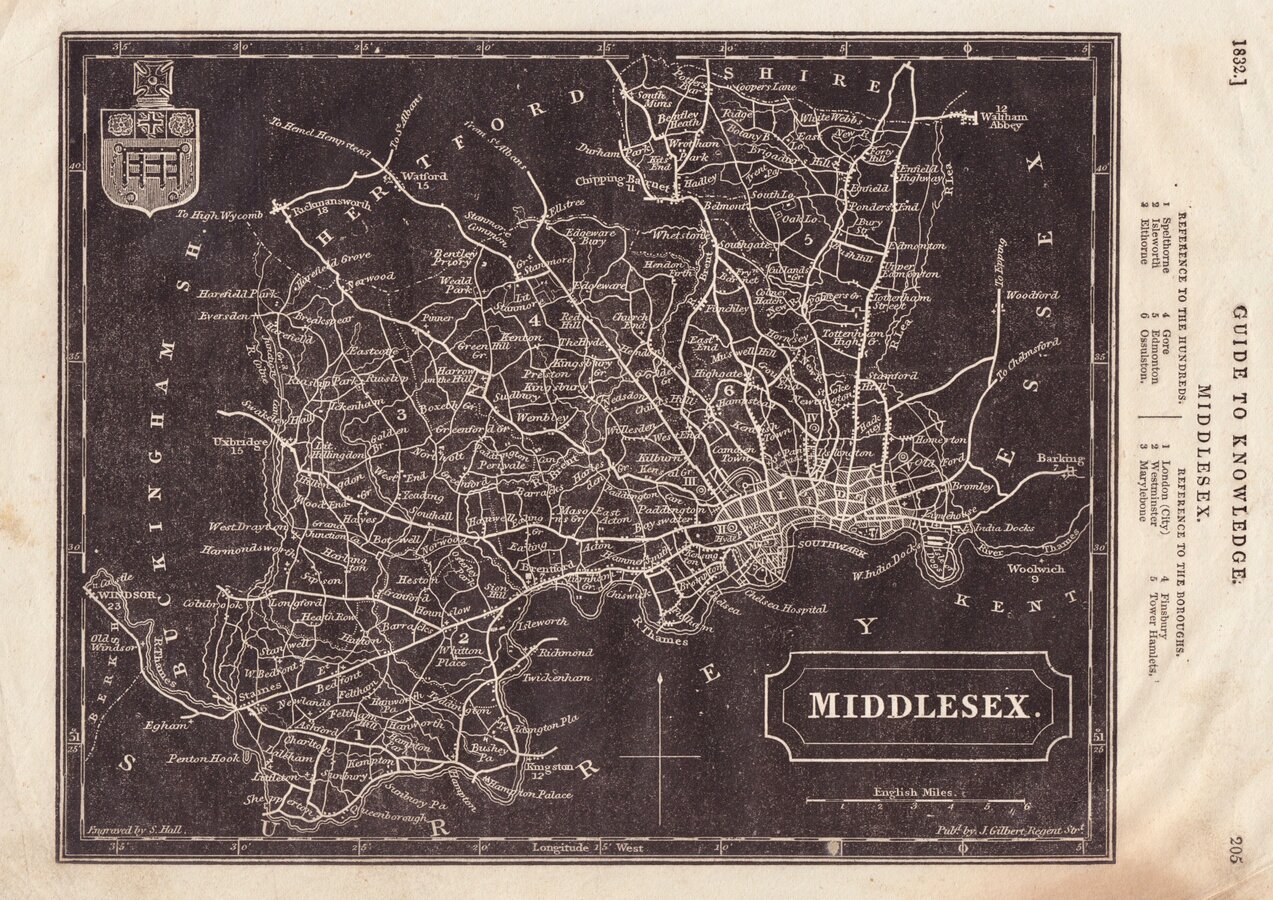 William Pinnock (1782-1843), born in Alton, Hampshire became a schoolmaster. In 1817 he moved to London and, in partnership with Samuel Maunder, began the publication of cheap educational works. The Guide to Knowledge was a publication issued in weekly parts between 1833 and 1834 and containing maps printed from the woodblock with the incised lines appearing white on a black ground. The technique proved unpopular for topographical maps and was not used again, the county maps were issued later in a more traditional format by lithographic transfer in Johnson's Atlas of England in 1847 & 1863.