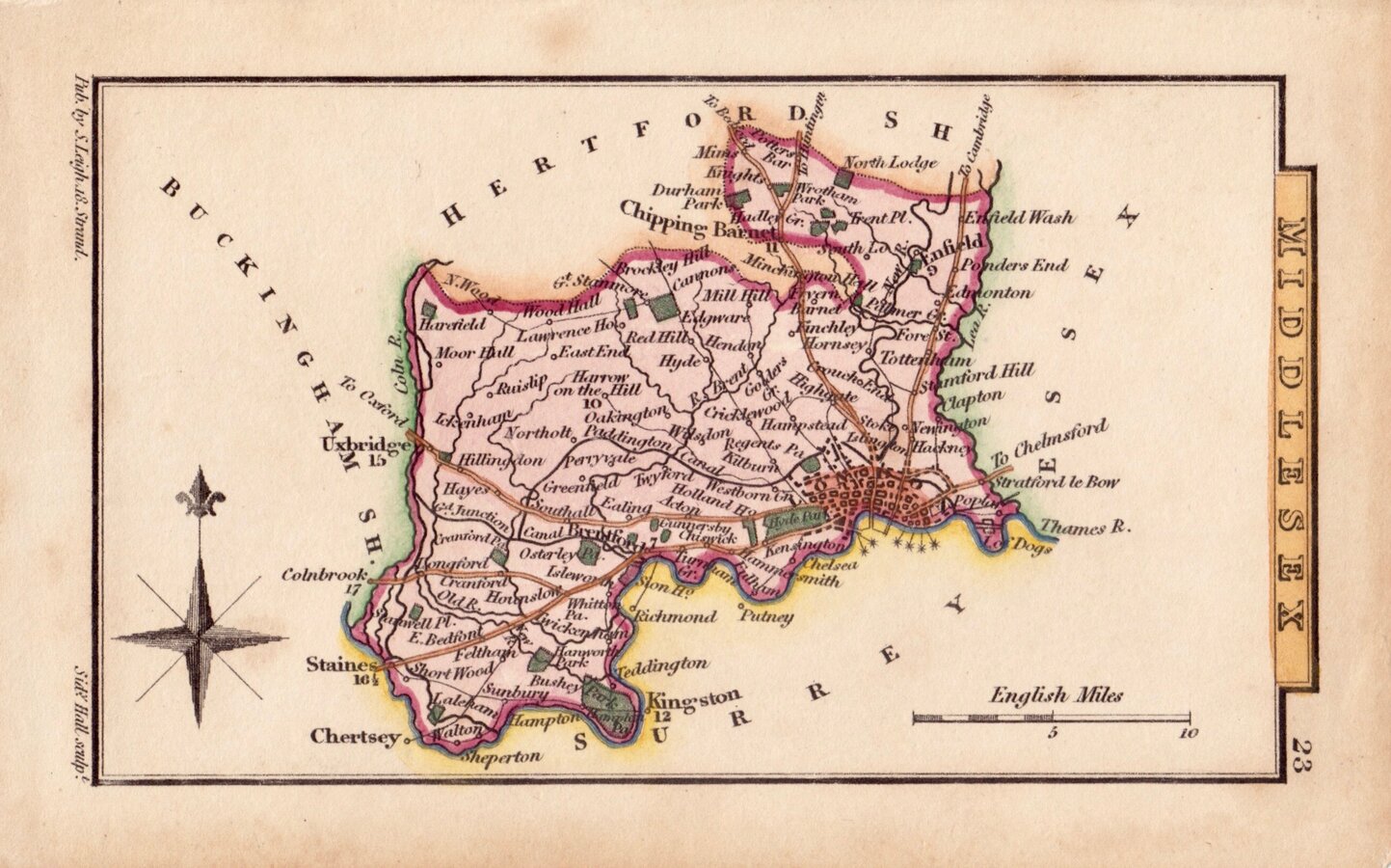 Miniature map engraved by Sidney Hall and first published by Samuel Leigh in Leigh's New Pocket Atlas of England and Wales in 1820. The demand for pocket atlases for the traveller was high during the first half of the 19th century and this little atlas, Samuel Leigh's only cartographic work, was very popular, running to ten editions with publications continued after his death by his widow and then his son until 1839. The plates were then acquired by George Biggs who published them a number of times until 1843.
