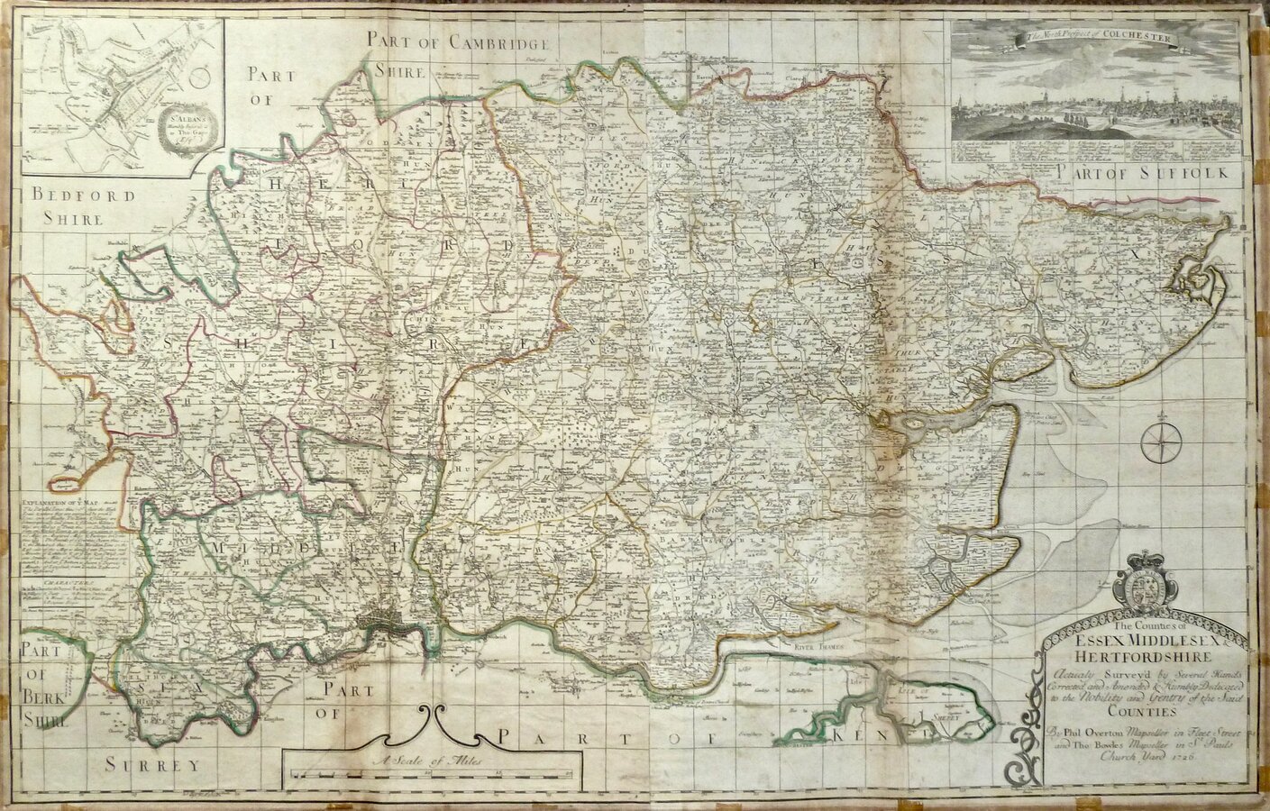 A reduced version of John Warburton, Joseph Bland and Payler Smyth's 6½ sheet map of the three counties published in c.1724. This reduced map, published by Philip Overton and John Bowles, is printed on two sheets joined and includes a town plan of St. Albans and a prospect of Colchester.