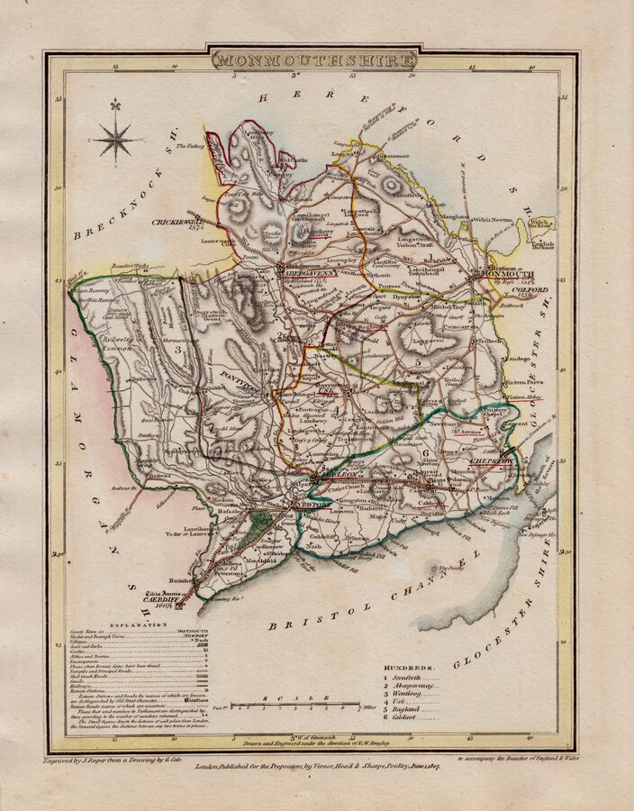 Engraved by John Roper (1771-1810), a London engraver and copperplate printer trading from New Street Square from 1797 until his death in 1810. His widow, Mary Roper, continued the business at the same address until at least 1846. This series of maps, most drawn by G[eorge?] Cole, were intended to accompany The Beauties of England and Wales. The maps were not actually published with this work but first issued in parts as a separate series between 1804 and 1810 and first appearing in atlas form in The British Atlas published by Vernor Hood & Sharpe (& nine other publishers) in 1810. The maps were re-issued in several publications including Dugdale's Curiosities of Great Britain until 1843. Their final appearance was by lithographic transfer in Collins' railway and pedestrian atlas… published by Darton and Co. in 1858.