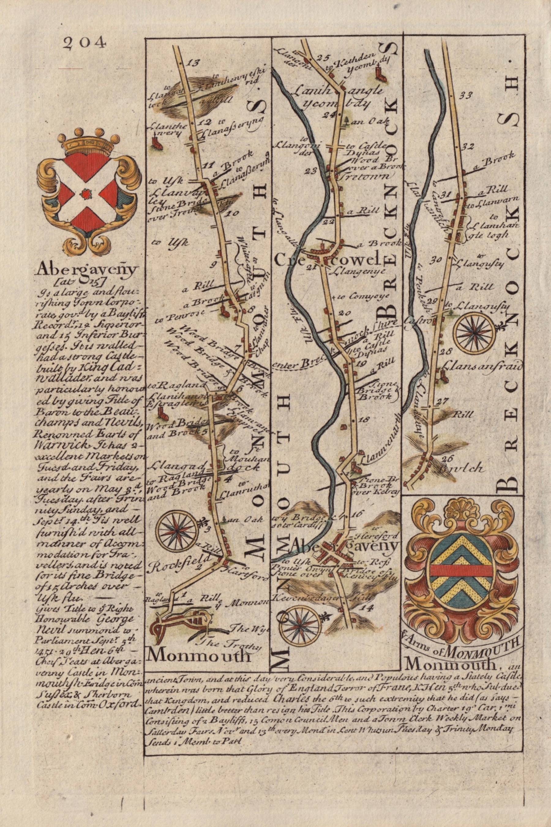 The map is set below a decorative cartouche containing the title for the road from Monmouth to Llanbeder and has the first part of that road verso.