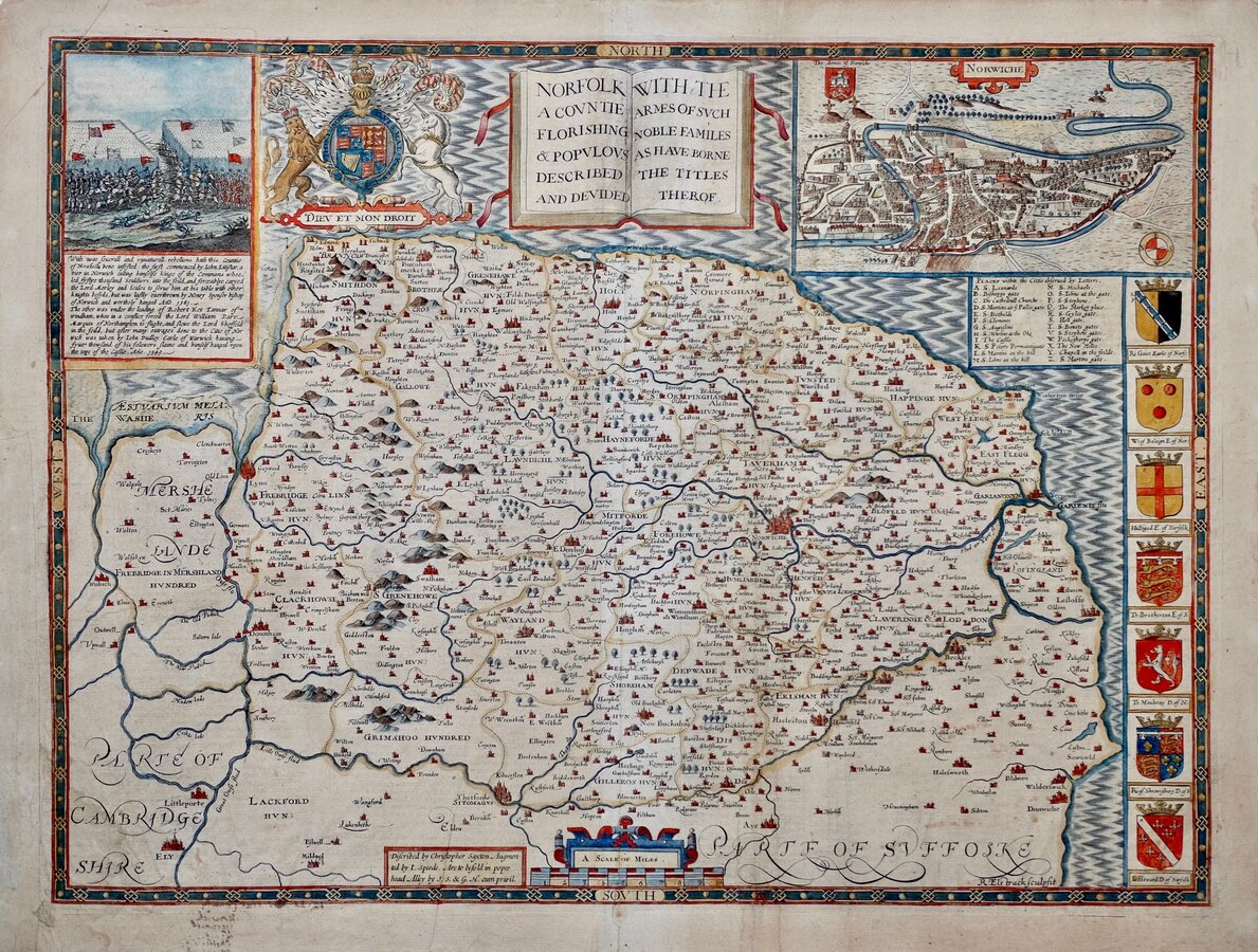 Town Plan of Norwich, battle scene, six armorials of Norfolk nobility, and Royal arms.