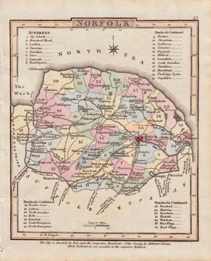 The Norfolk map was re-engraved for the 1822 edition with North to the top of the page.