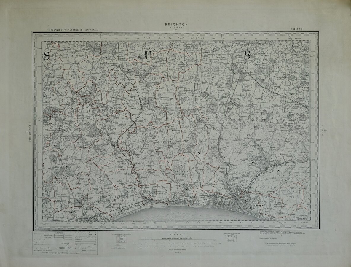 ORDNANCE SURVEY OF ENGLAND (Third Edition) 1912 BRIGHTON SHEET 318 Showing Brighton. Hove. Shoreham. Steyning. Condition: Fair. Some red ink lines to parish boundaries.