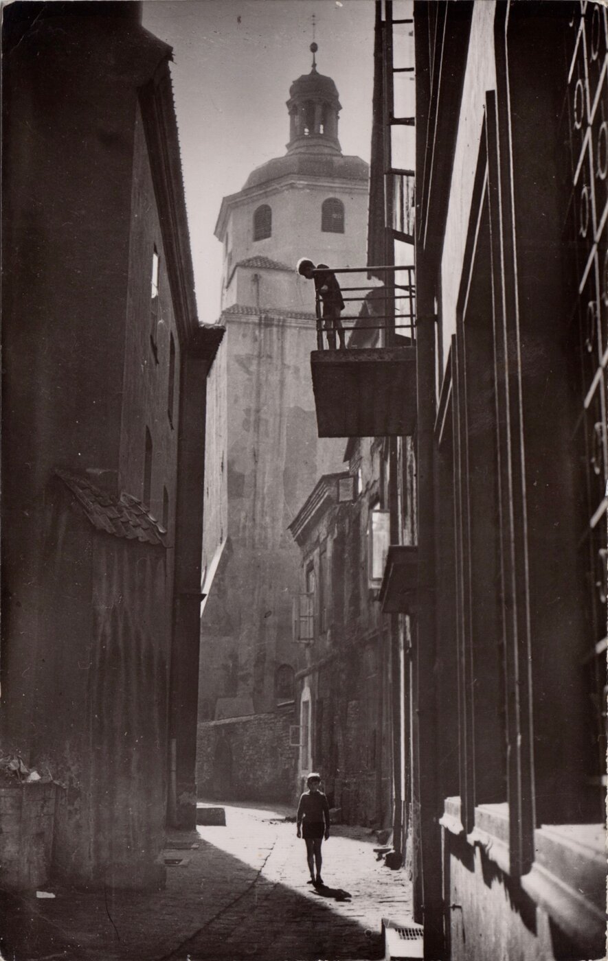 Real Photo Postcard by Edward Hartwig of the 14th century Brama Krakowska, Cracow Gate, from the narrow street, Szambelanska in the Old Town of Lublin, Poland, with figures of young boys in the street and balcony above.