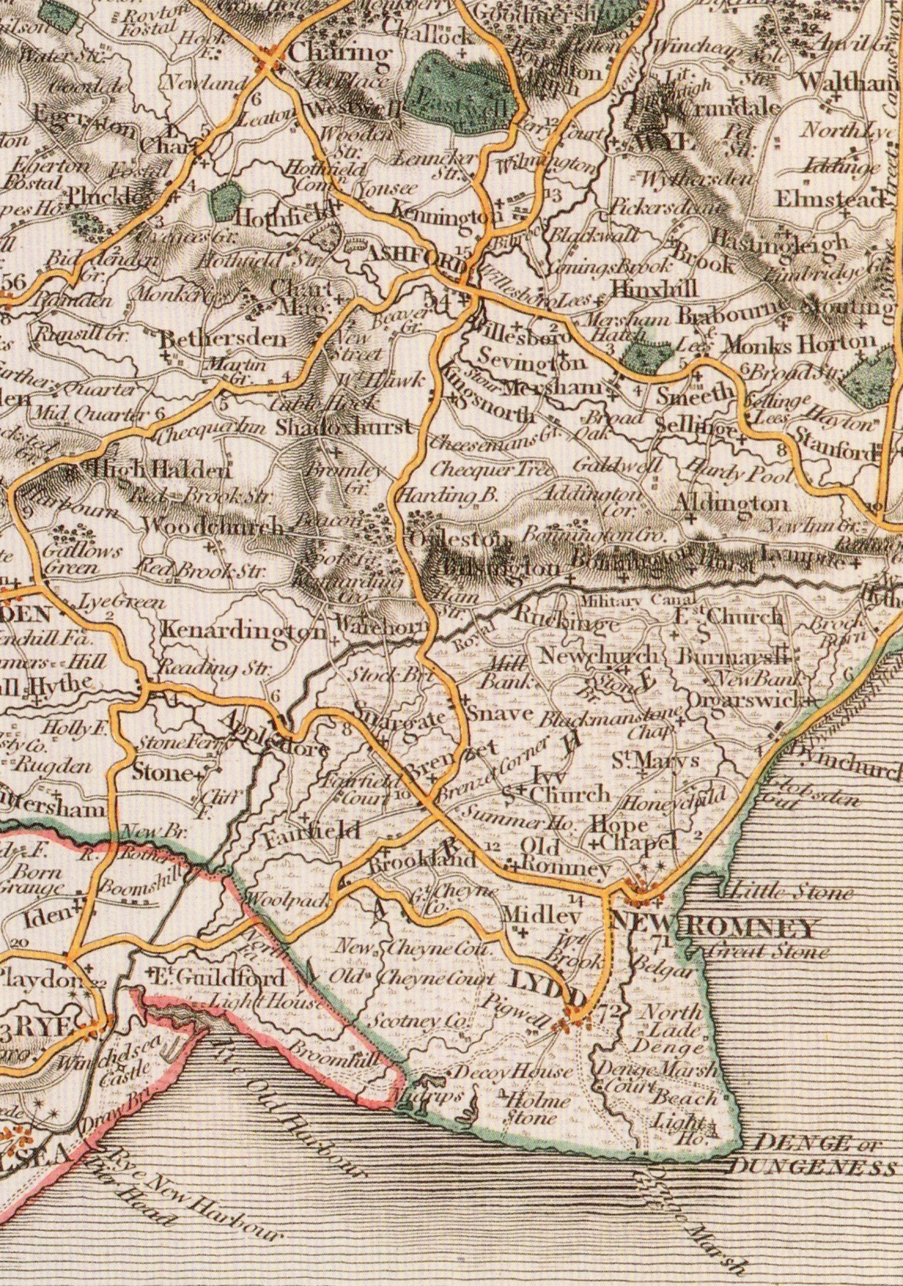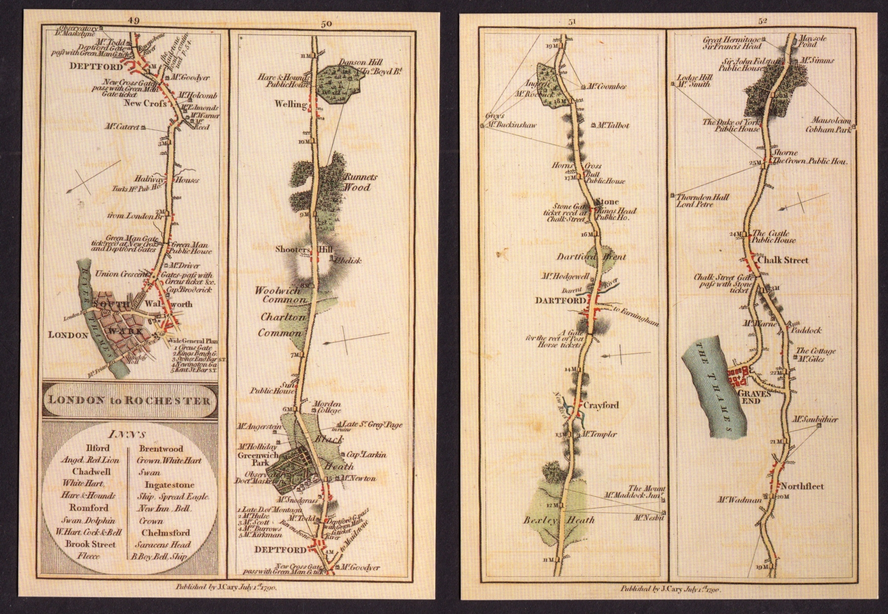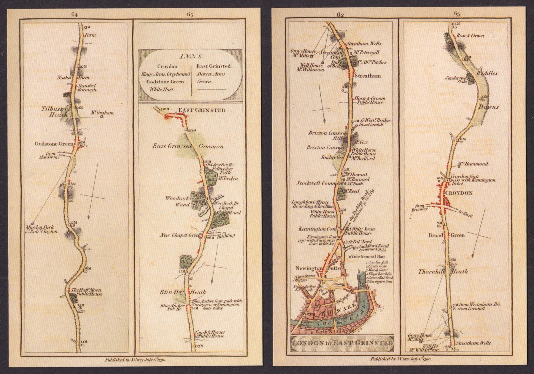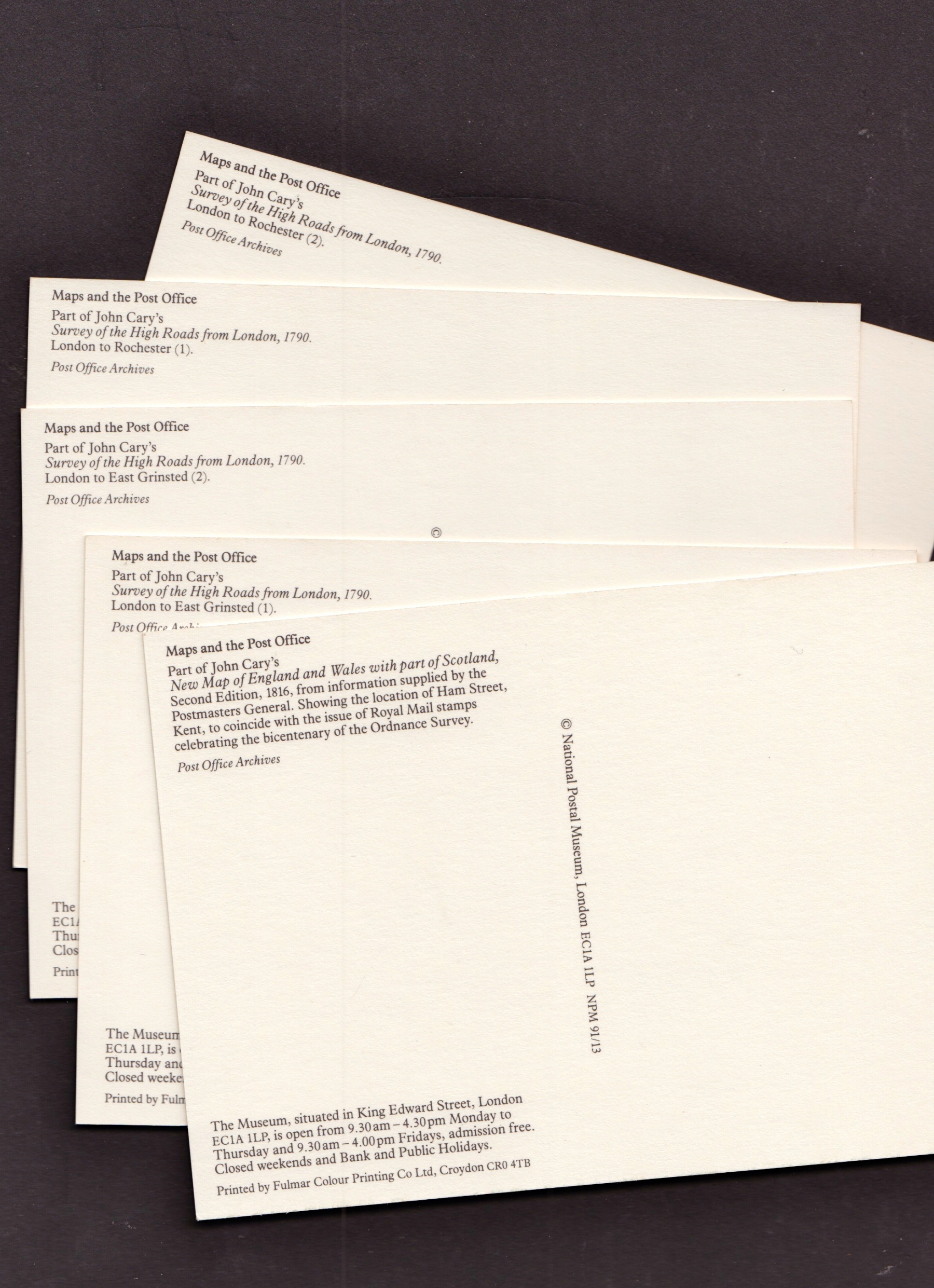 4 Postcards with reproductions of 4 maps from John Cary's High Roads from London showing start of London to Rochester and London to East Grinstead. 1 card with reproduction of part of John Cary's New Map of England and Wales showing Rye, Ashford and Romney in Sussex and Kent.