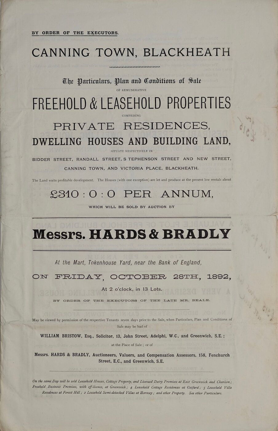 Particulars, Plan & Conditions of Sale...PRIVATE RESIDENCES, DWELLING HOUSES AND BUILDING LAND...on FRIDAY, OCTOBER 28th, 1892.