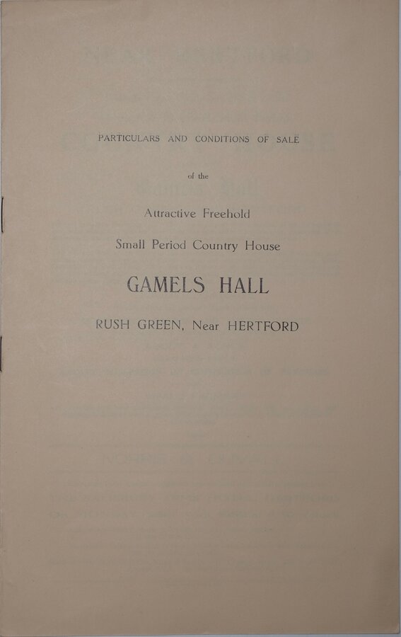Particulars and Conditions of Sale of the Attractive Freehold Small Period COUNTRY HOUSE known as Gamels Hall RUSH GREEN, NEAR HERTFORD...which NORRIS & DUVALL are instructed by the Executors of the late Mrs. Chalmers Hunt to Sell by Auction at the THE SALISBURY ARMS HOTEL, HERTFORD On MONDAY, 28th April, 1952 at 4.30 o'clock