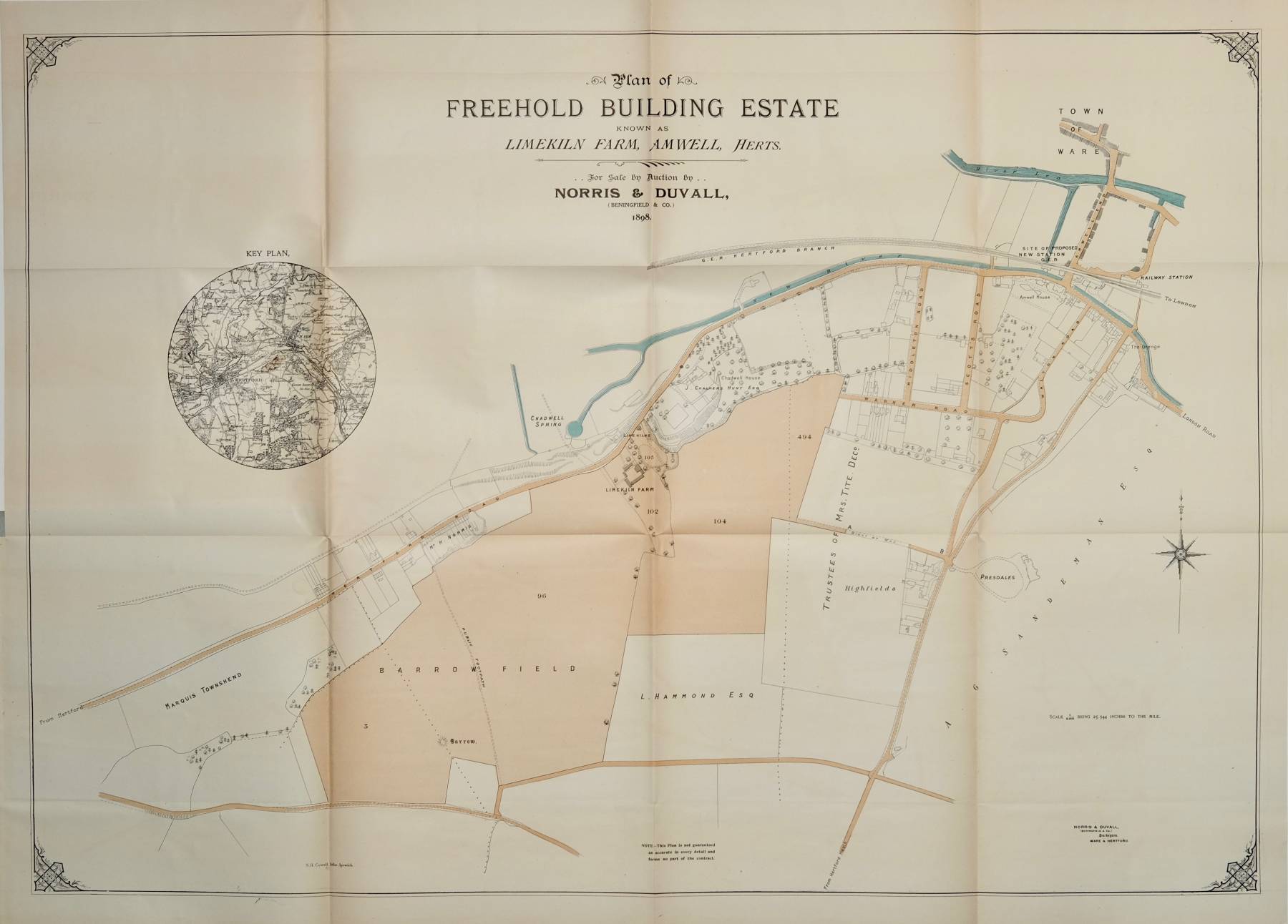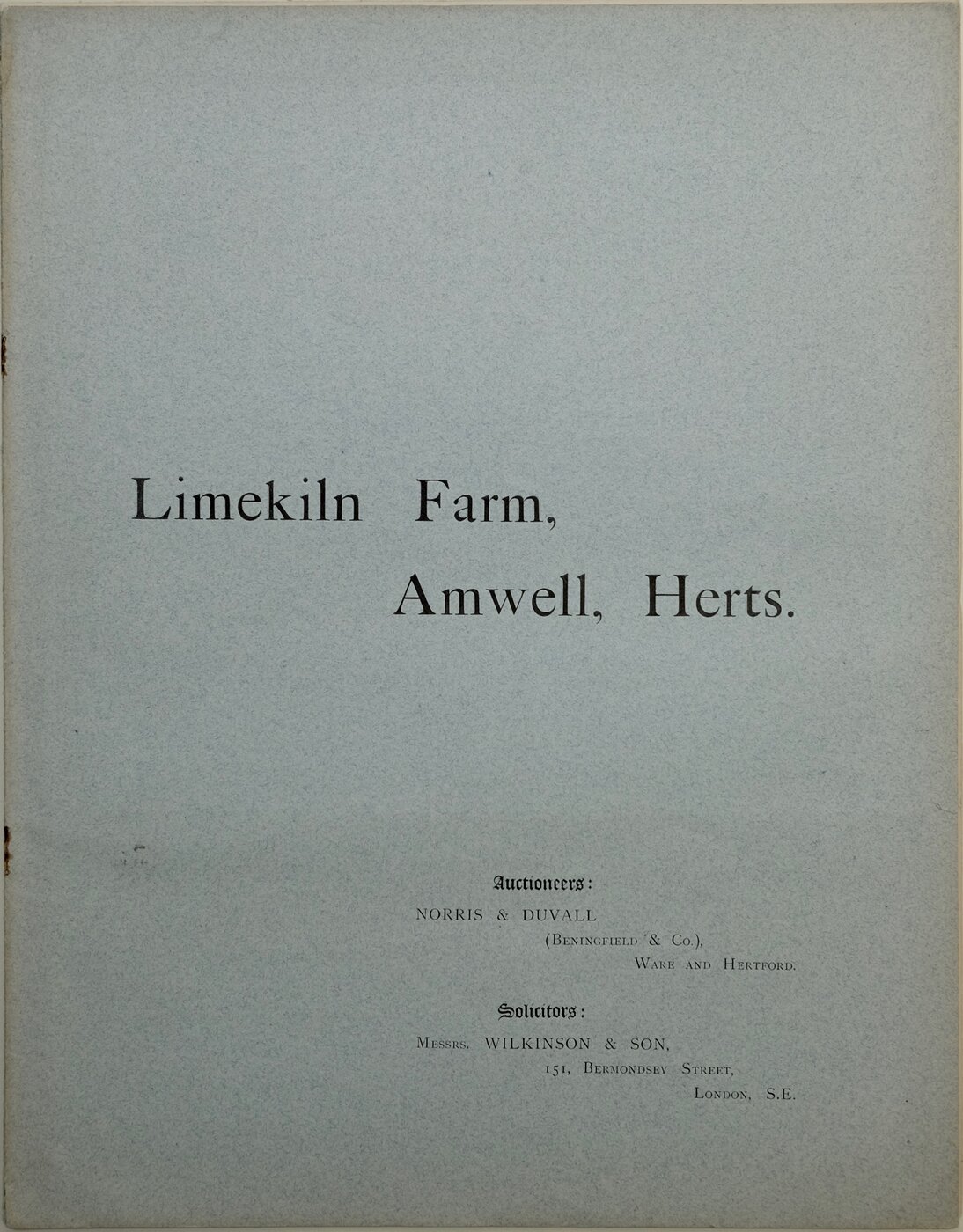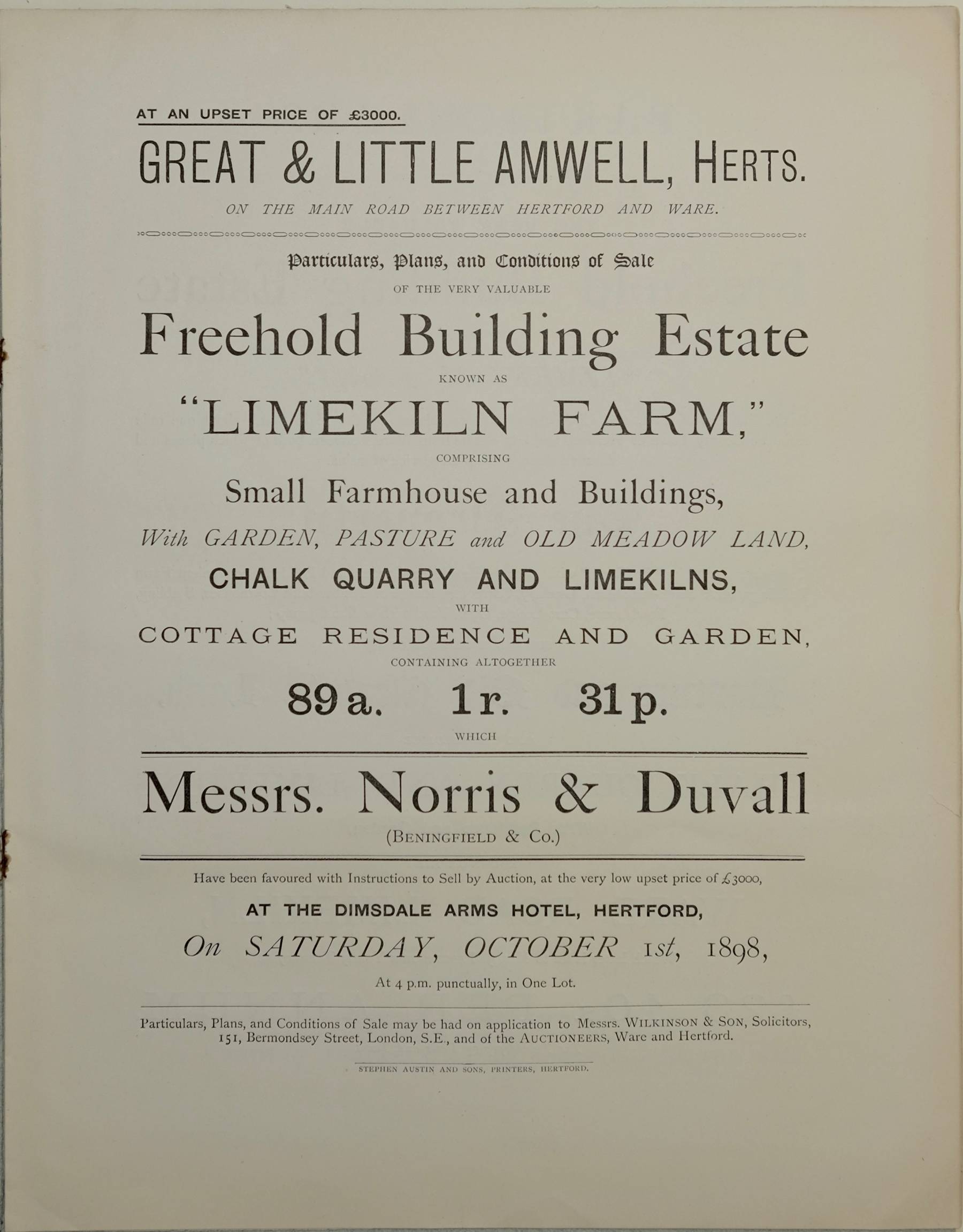 GREAT & LITTLE AMWELL, HERTS... Particulars, plans, and Conditions of Sale...Freehold Building Estate known as "LIMEKILN FARM,"...Messrs. Norris & Duvall (Beningfield & Co.) Have been favoured with Instructions to Sell by Auction, at the very low upset price of £3000, At the Dimsdale Arms Hotel, Hertford, On Saturday, October 1st, 1898, at 4 p.m. punctually in One Lot.