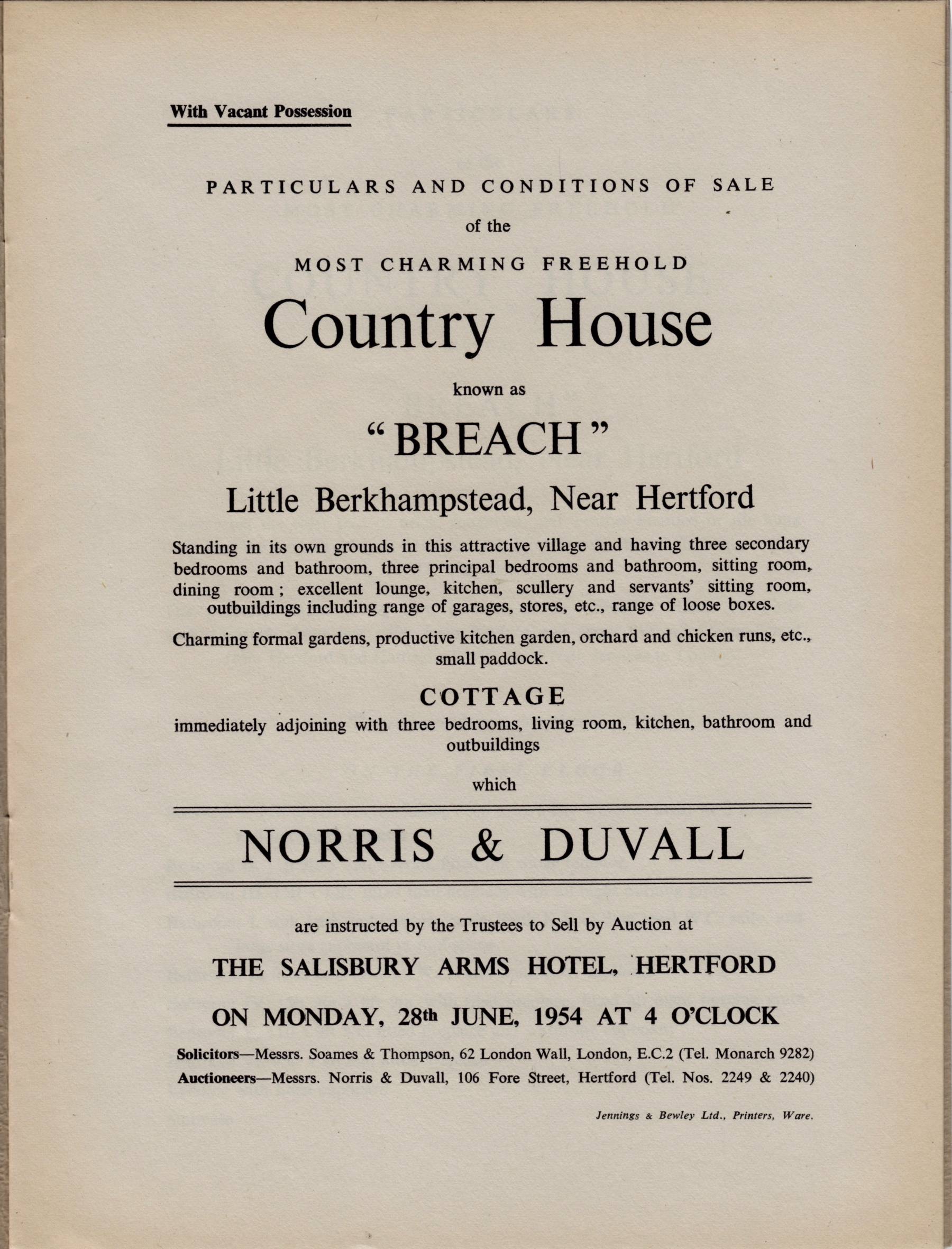 "Breach" Little Berkhampstead , Near Hertford 19x25 paper covers. Photograph to front cover. 6 pages. Estate sale particulars Monday 28th June 1954. Fine condition.
