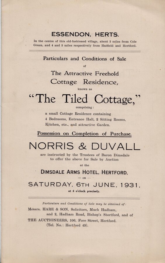 Particulars and Conditions of Sale of The Attractive Freehold Cottage Residence, known as "The Tiled Cottage"...Norris & Duval..at the Dimsdale Arms Hotel, Hertford, on Saturday 6th June 1931.