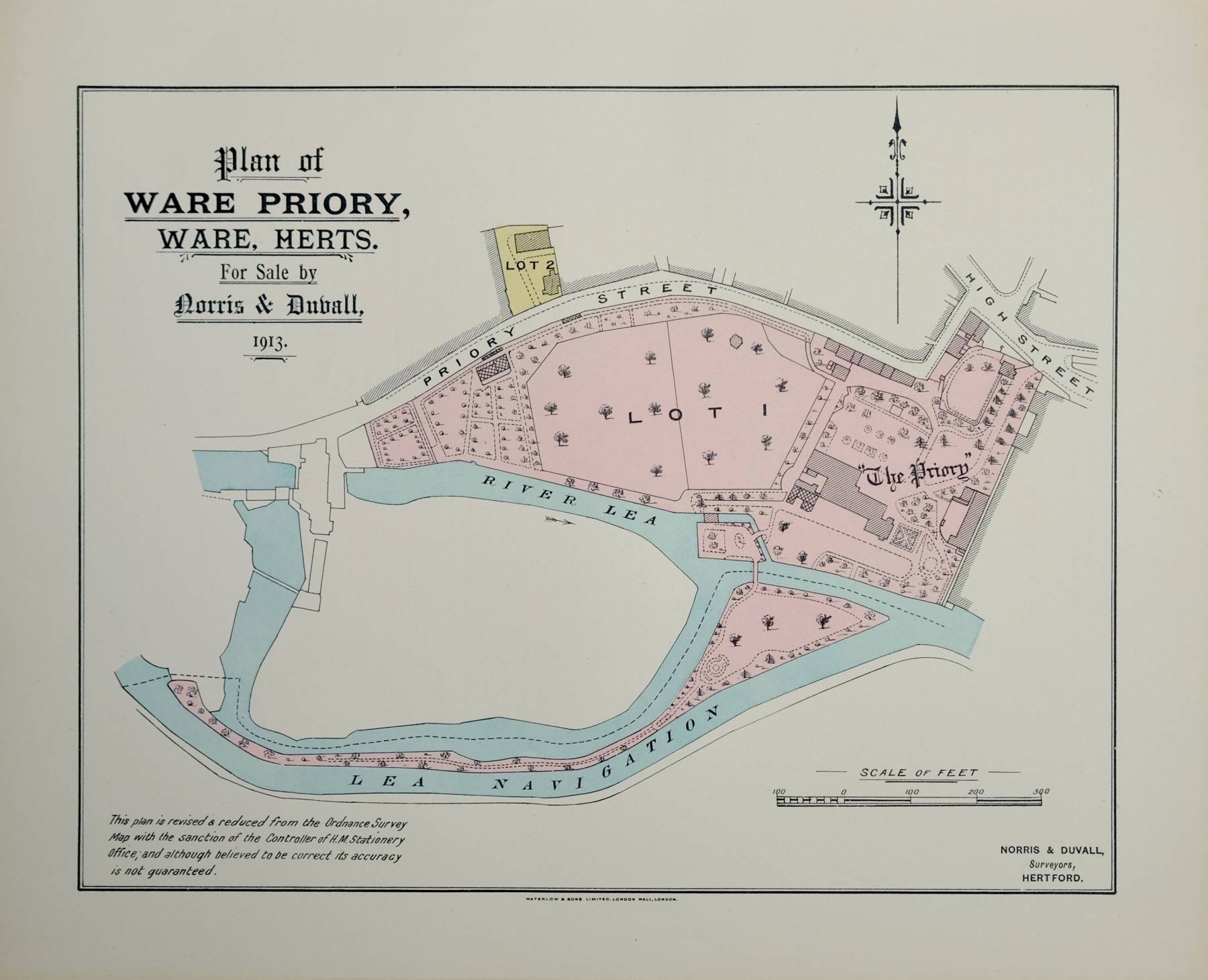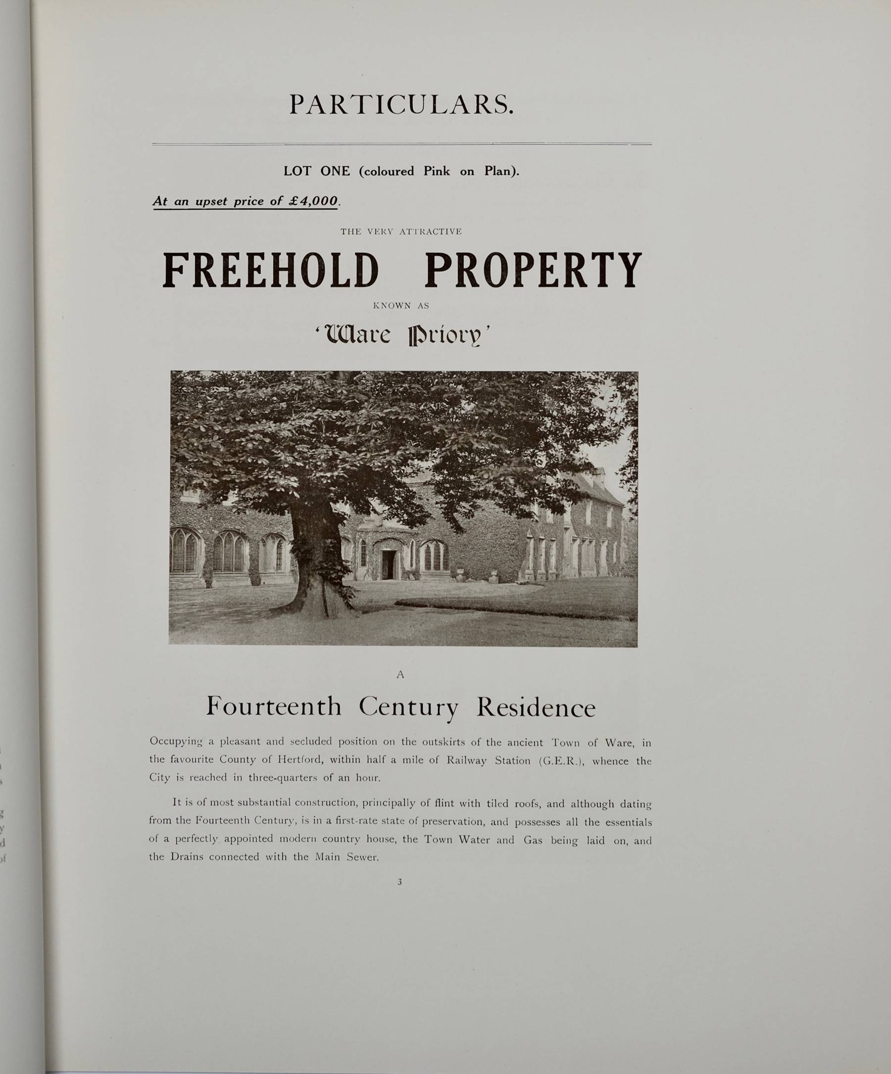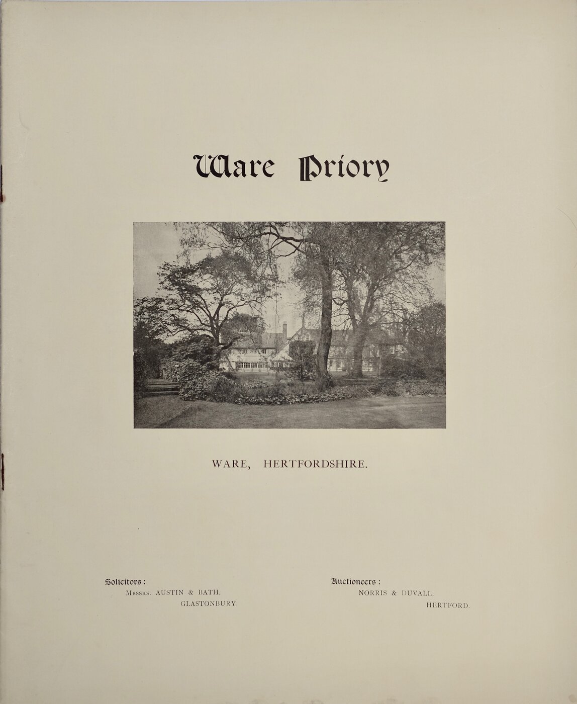 At an upset price of £4,000.HERTFORDSHIRE. WARE PRIORY,WARE....Particulars, Plan, and Conditions of Sale OF THE VERY VALUABLE FREEHOLD RESIDENTIAL PROPERTY KNOWN AS 'WARE PRIORY'...WHICH NORRIS & DUVALL Have been favoured with instructions from the Representative of the Late Mrs. R. WALTERS to Sell by Auction, at the DIMSDALE ARMS HOTEL, HERTFORD, On SATURDAY, JULY 12, 1913, at 4 o'clock precisely...