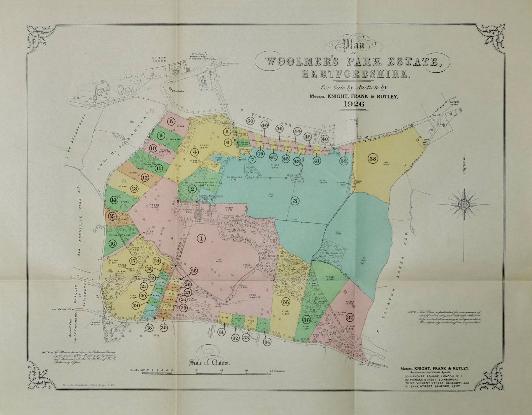 Particulars and Conditions of Sale of the Beautiful Freehold Residential Sporting and Building Estate known as WOOLMER'S PARK...To be offered for Sale by Auction by Messrs. KNIGHT FRANK & RUTLEY... At the Corn Exchange, Hertford On Thursday the 16th day of December, 1926.