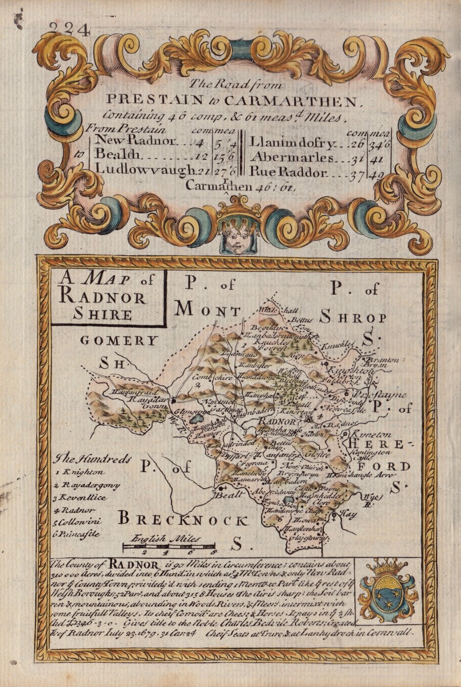 Map set below a decorative cartouche containing the title and details of the road from Prestatyn to Carmarthen. Arms of Roberts and decription of the county below.
