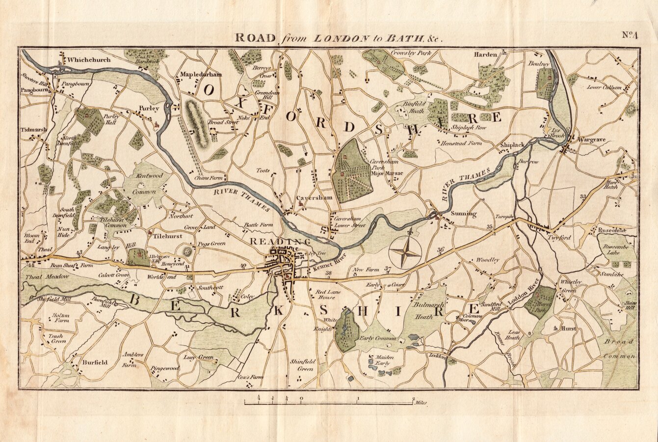 A very good and uncommon map of part of the road from London to Bristol showing Reading, Twyford, Sonning, Shiplake, Wargrave, Hare Hatch, Ruscombe, Hurst, Burghfield, Theal, Calcot, Tidmarsh, Pangbourne, Whitchurch-on-Thames, Purley-on-Thames, Caversham, Binfield Heath, Shiplake, Harpsden.