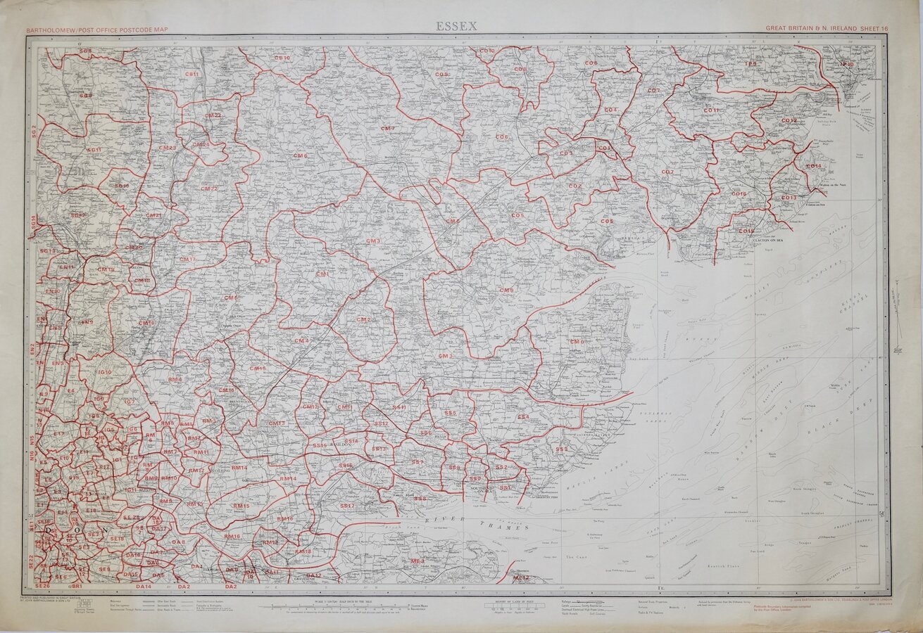 Sheet 16 titled ESSEX from a series of 63 maps covering Great Britain and Northern Ireland, produced at a scale of Half Inch to a Mile by John Bartholomew & Son and The Post Office and published in 1974. Overprinted in red with postcodes and postcode boundaries.