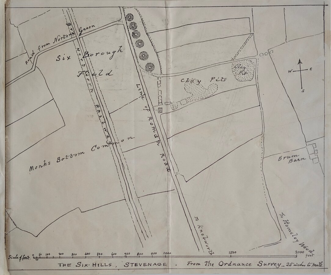 Undated, crudely drawn lithograph printed map of the Roman barrows known as The Six Hills in Stevenage. Now a protected monument, they are situated in the centre of Stevenage alongside the A602 behind a supermarket complex. The map is based on the 1881 25 inch to the mile Ordnance Survey map surveyed in 1880.