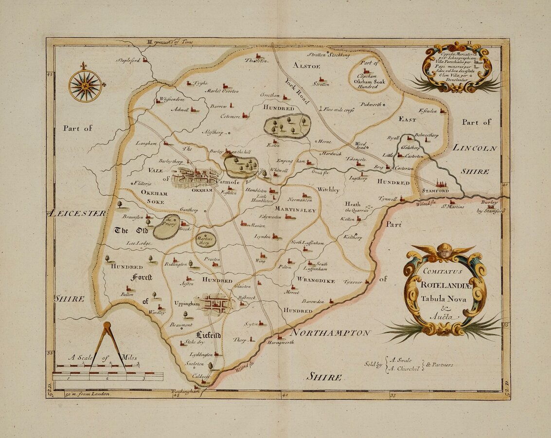 The Rutland plate differs in style from others in the series as Morden amended the plate for the map published in The History and Antiquities of Rutland... by James Wright...Bennet Griffin, 1684. The amendments include the addition of the border with minutes of time and degrees, an additional scale, and the publisher's imprint.
