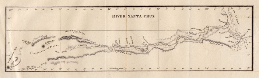 Surveyed by Charles Darwin and Robert Fitzroy in April 1834 during an expedition to find its source while the Beagle was laid ashore for repairs. Although they failed to reach the source, Fitzroy produced a paper on the the expedition which was published in the Journal of the Royal Geographical Society in 1837 which included this chart from the mouth of the river to Mystery Plain.