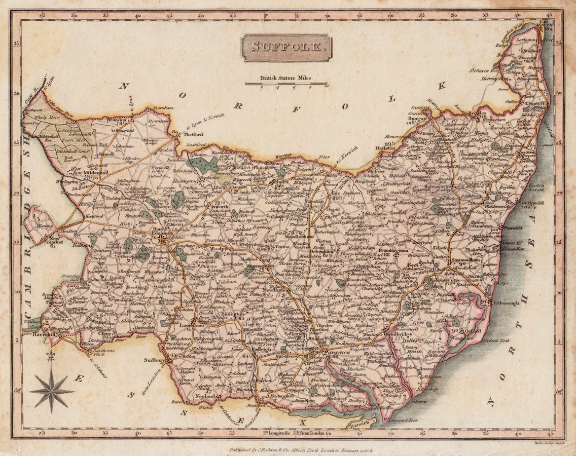 This map of Suffolk has the imprint of J. Robins & Co dated 1818 published in Robins's Atlas of England and Wales... in 1819 and The New British Traveller c.1820.