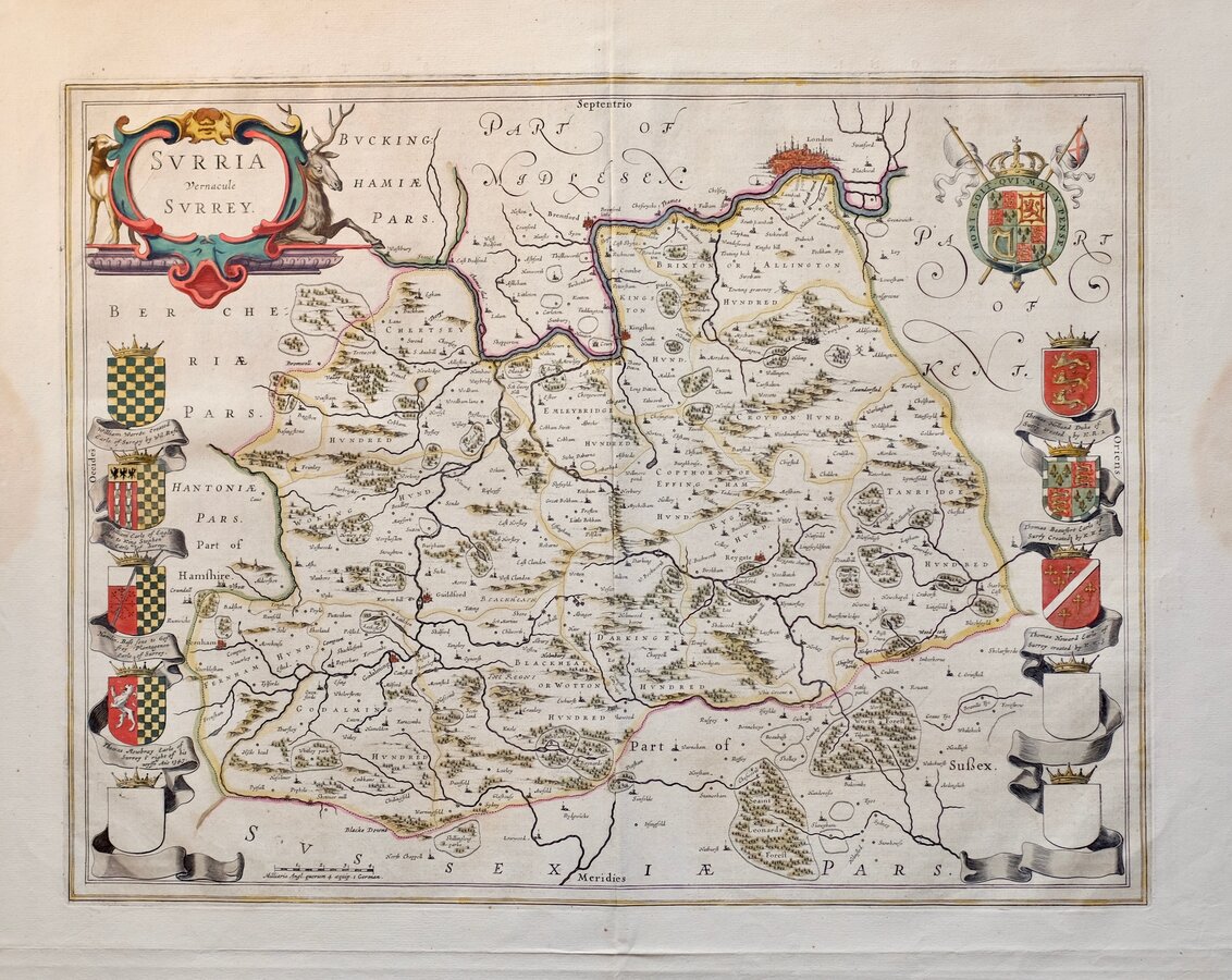 Copper engraving by Jan Blaeu (1596-1673) the son of William Janszoon Blaeu (1571-1638), founder of the famous Dutch publishing house. The county maps of England and Wales appeared in the fourth volume of their world atlas, Theatrum Orbis Terrarum in 1645. The work commenced publication with the first volume in 1630,meventually expanding to 12 volumes. The English county maps were closely copied from the 1623 edition of John Speed's Theatre of the Empire of Great Britaine, with the text verso, translated into various languages from William Camden's Britannia. The production of the maps was of the highest quality with consistently fine and uniform engraving embellished with decorative title cartouches and armorial bearings, the printing was carried out in Blaeu's own printing house, using the finest quality rag paper, the maps usually completed with hand colouring carried out within Blaeu's own workshops. The atlases containing the English county maps were published from 1645 until 1667, the maps remained unaltered throughout the publication period. The language and setting of the typeset text verso was changed for each edition, enabling the identification of a loose map. A fire at Blaeu's printing house in 1672 destroyed most of the plates and Jan Blaeu died the following year, effectively ending the Blaeu publishing dynasty.