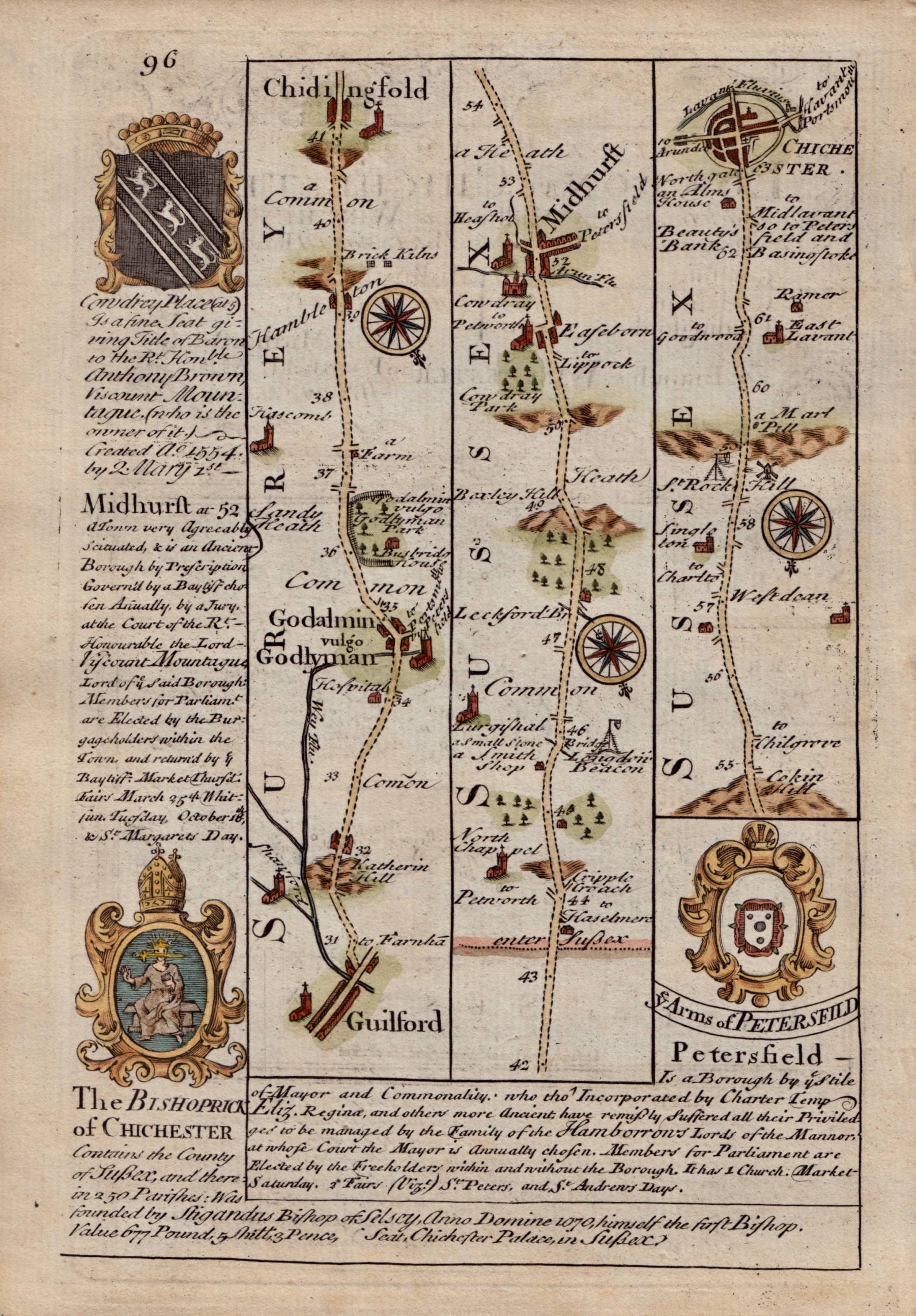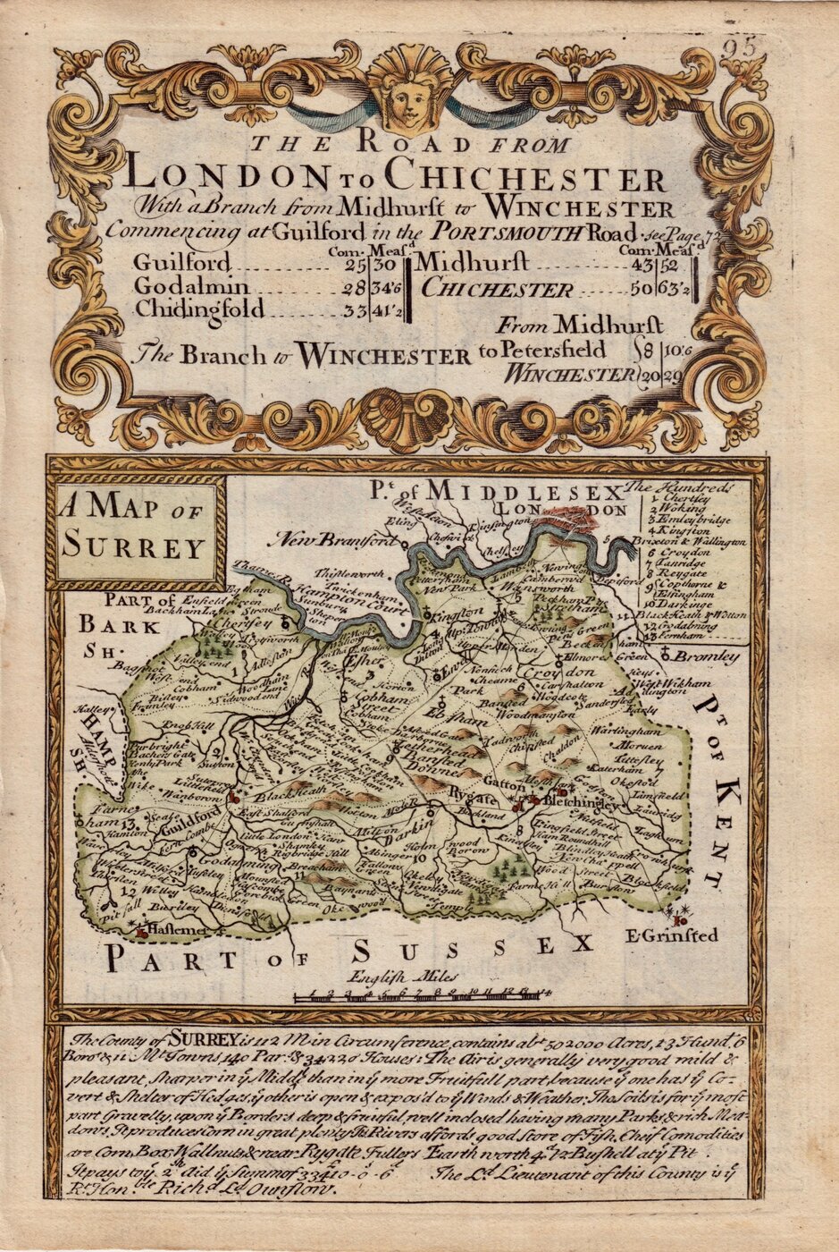 Copper engraving by Emanuel Bowen published in the pocket road book Britannia Depicta by Thomas Bowles from 1720. This was the first truly pocket sized road book for the traveller based on the surveys of John Ogilby published in large folio format 45 years earlier in 1675. It was last and most successful of four separate schemes to produce such a work within the space of two years, running to over fifteen editions until 1764. The other road books were by Thomas Gardner and John Senex. The work by Herman Moll was not completed. The books by Gardner and Senex were simple reductions of John Ogilby's plates but the plates for Britannia Depicta included a wealth of historical, topographical and informative notes compiled by John Owen, arms of major towns and worthies and a set of small county maps. The plates were printed on both sides of the paper, reducing the weight of the volume. Descriptions by John Owen were engraved on the copperplate surrounding the maps and also on separate plates. The maps have become commonly known as "Owen & Bowen" maps.