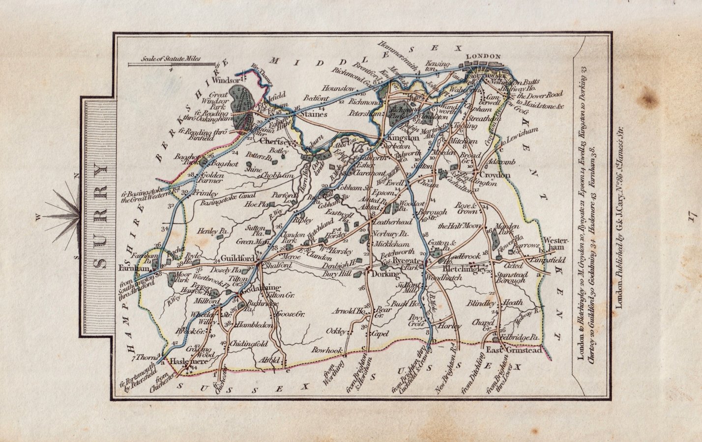 Surrey from the 1st state of the re-engraved plate of 1822 in original hand colour. Some finger marking in margins.