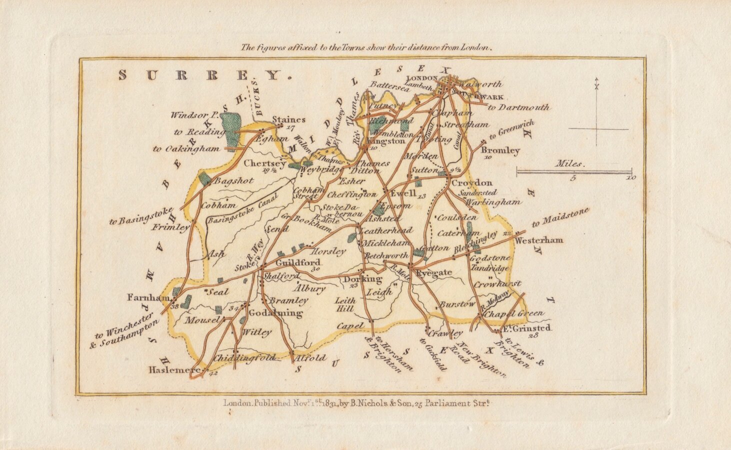 This example, with the publisher's imprint B. Nichols and Son, is from one of the three later publications. It includes a scale bar.  A scale bar was included in Crosby's Gazetteer but not in The Compendium, Britannia Epitomized, and the first issue of Family Topographer and was added to most counties in the second issue of the Family Topographer.