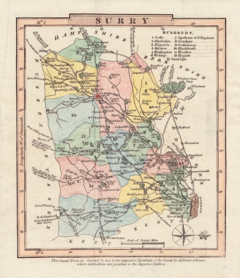 This hand coloured example of the map of Surrey is the first state of the plate, without plate number top right, issued between 1806 and 1822.
