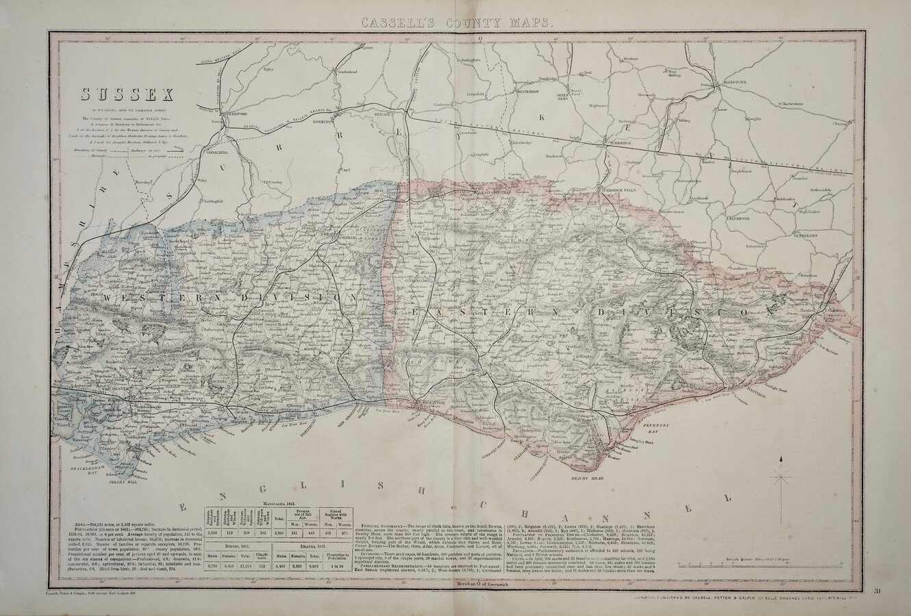 This example of the map of Sussex is the fourth lithographic transfer, with statistical information in typeset text transferred to the lithographic plate, published in Cassell's British Atlas...London Cassell, Petter & Galpin 1867.