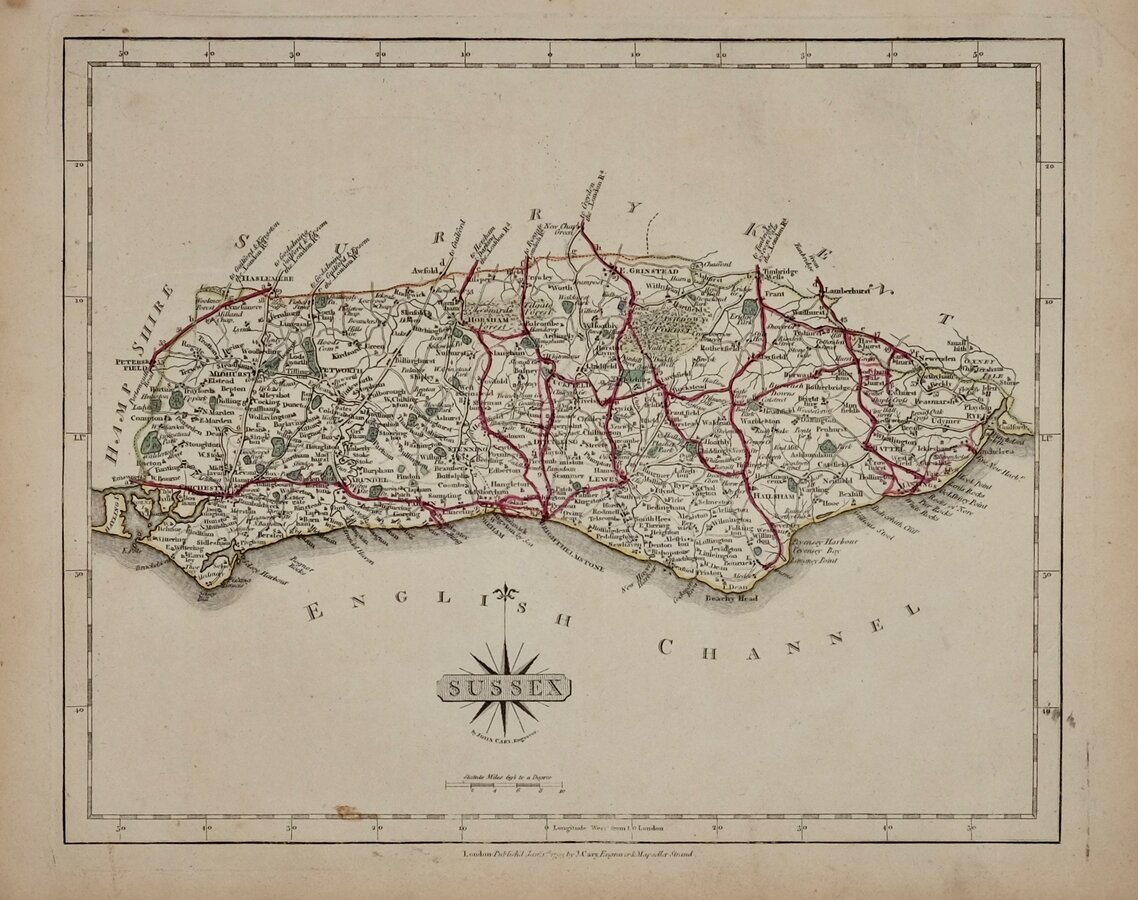 Final state of the plate published in Cary's New and Correct English Atlas... London 1793. [issued 1808]. Original hand colour but with later red line to many roads.