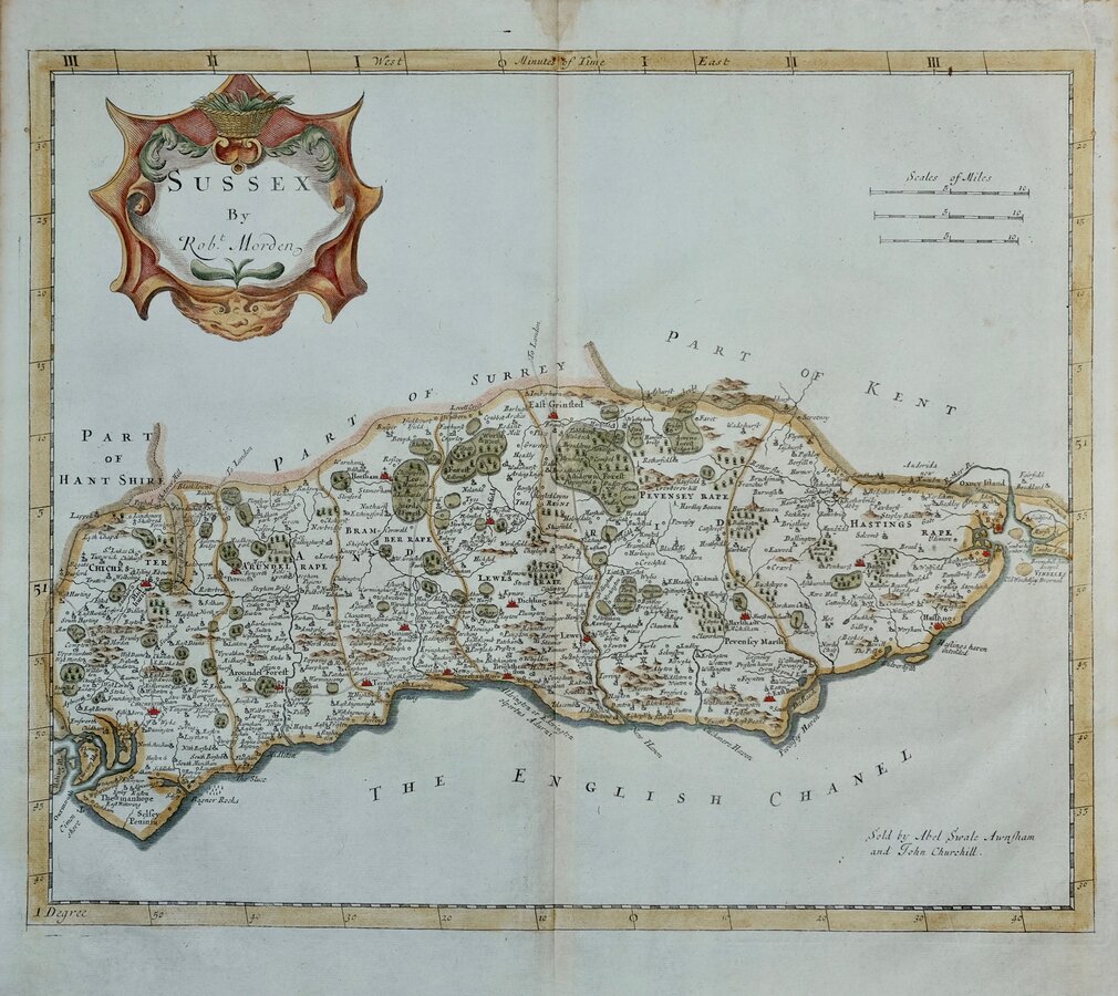 Copper engraving produced by Robert Morden for publication in Edmund Gibson's translation of William Camden's Britannia first  published by Abel Swalle and Awnsham & John Churchill in 1695. This is the first series of maps to mark longitude in minutes of time (top border) as well as in degrees (bottom border). For most counties longitude is based on the meridian of St. Paul's, London, but for the map of Sussex, Morden used the meridian of Greenwich.